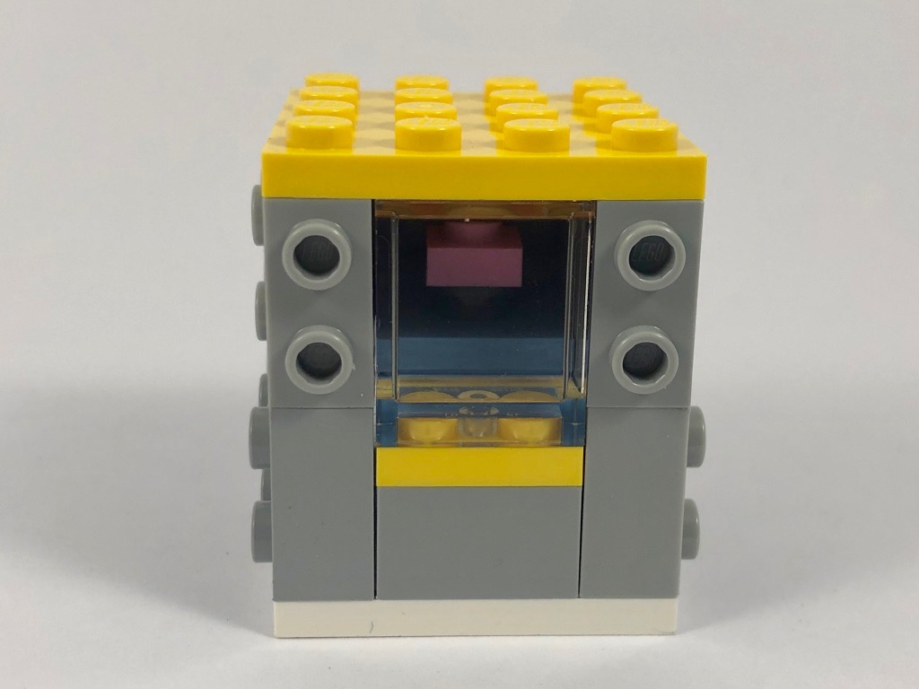 Une fois n’est pas coutume, nous commençons par la tête. Vous le savez certainement, Homer Simpson ne brille pas par son intelligence. Ainsi, petit détail croustillant, le designer a-t-il décidé de remplacer l’habituelle brique rose 2×2 faisant office de cerveau chez les autres BrickHeadz par une toute petite plate rose 1×1. Elle reste facilement visible en démontant le visage, au travers d’un panel transparent. Le reste de la construction de la tête est tout à fait basique.