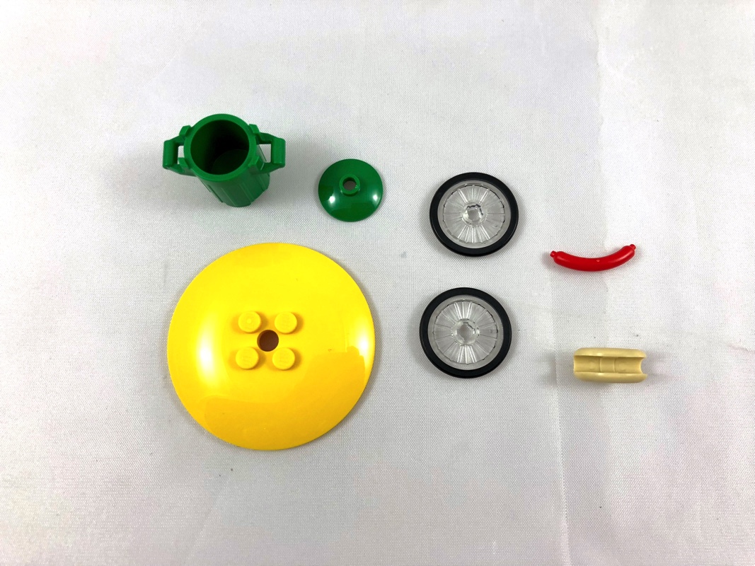 Petite mise en scène de notre set sur le polybag, visiblement dans Central Park à New York, dont on devine les gratte-ciels en arrière-plan au dessus des allées verdoyantes du parc. A l’intérieur, 49 pièces au total (dont 6 en rab’), et une notice d’instructions format A4 pliée, pour un total de 17 étapes de construction. On notera la présence de quelques pièces intéressantes, comme les deux grandes roues translucides, les saucisses avec le pain à hot-dog, ou encore la poubelle et son couvercle. Et une pièce plutôt rare, le Yellow Dish 6 x 6 Inverted (Radar) – Solid Studs du parasol, présent dans seulement 3 sets.