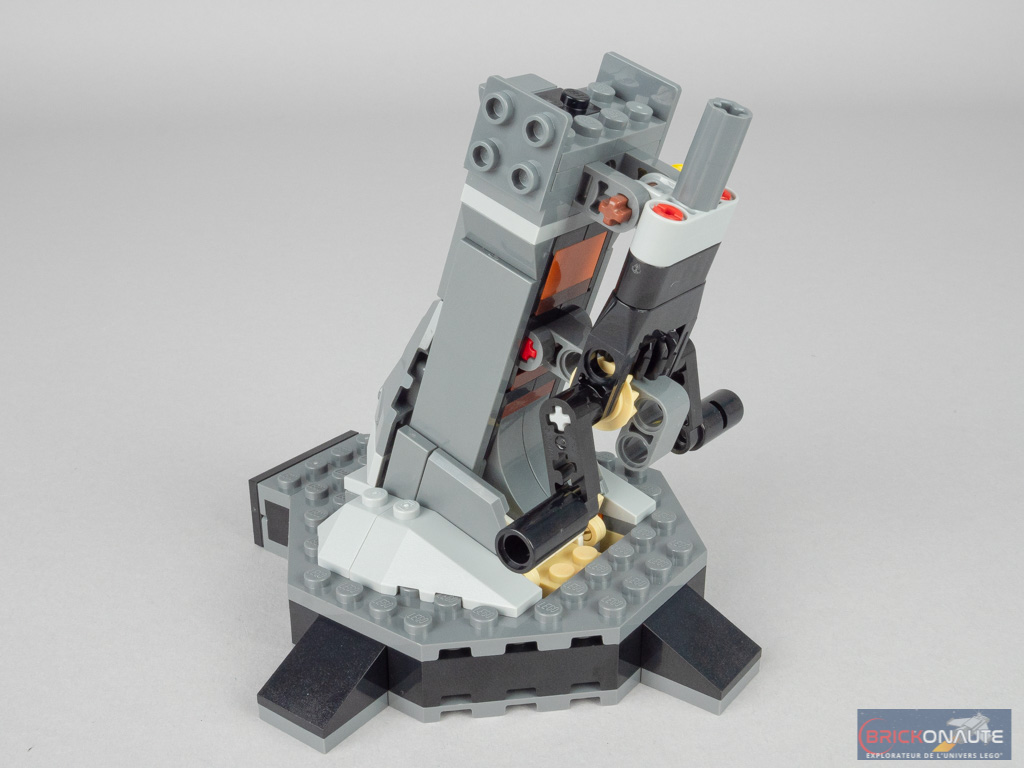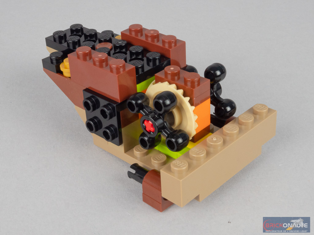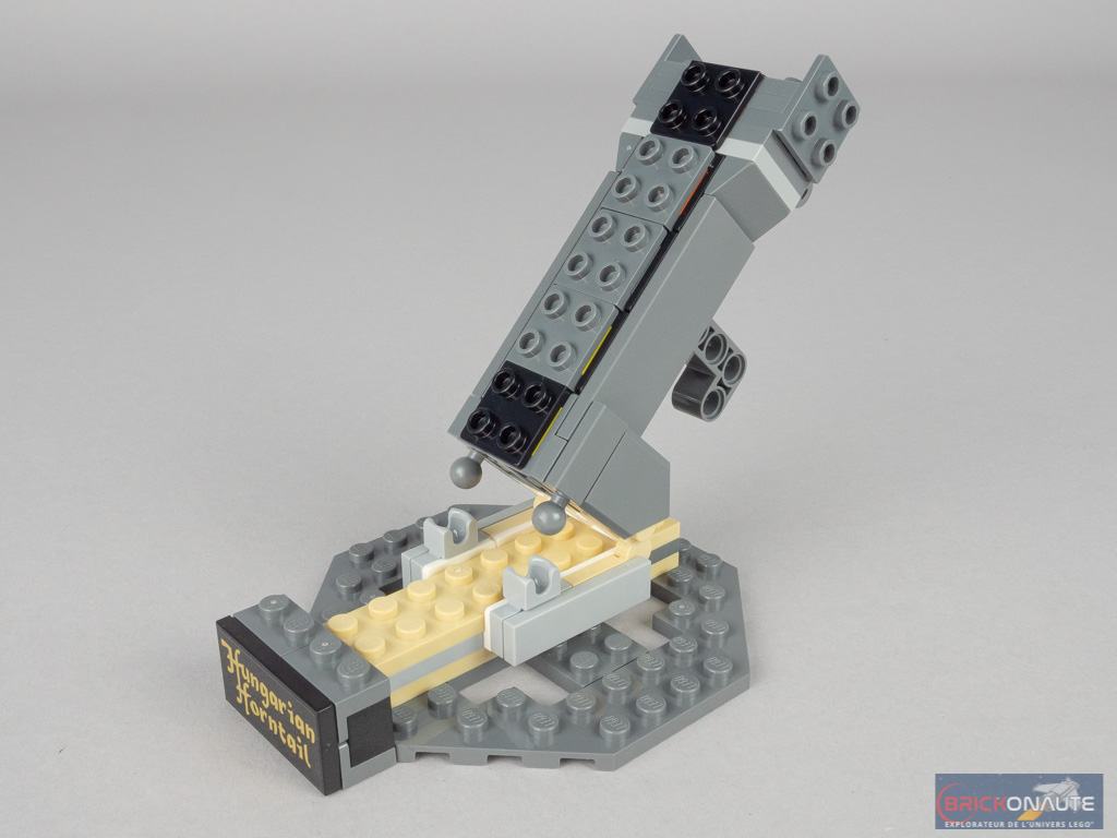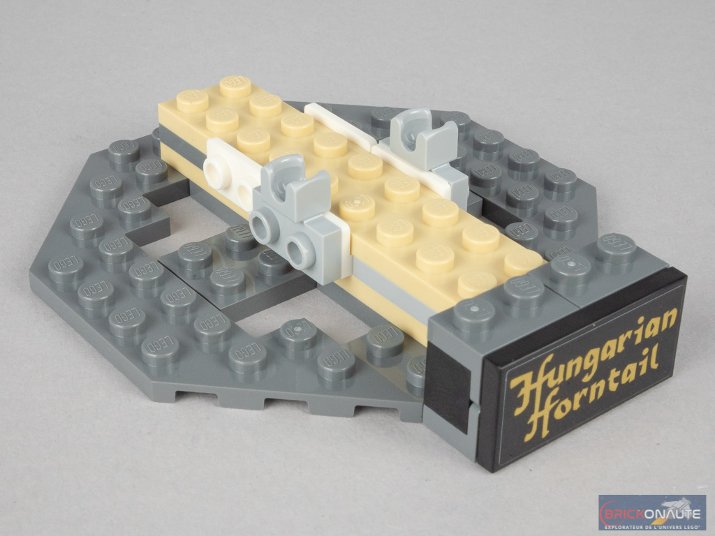 Nous commençons logiquement par le support, et plus particulièrement sa base de forme octogonale. Elle comporte quelques brackets pour la tile noire avec le nom du dragon, et deux ball joints femelles. On passe alors à un grand sous-ensemble, constitué pour l’essentiel d’éléments SNOT qu’on décore de pièces grises façon roche. On le relie par deux charnières et deux ball joints à la base, pour obtenir l’angle désiré. À l’arrière, on assemble le petit mécanisme Technic habituel avec ses 2 engrenages et ses 2 manivelles, qui permettront à notre dragon de battre des ailes. On termine cette première étape en ajoutant l’oeuf doré et une petite tige transparente pour faire voler Harry Potter.