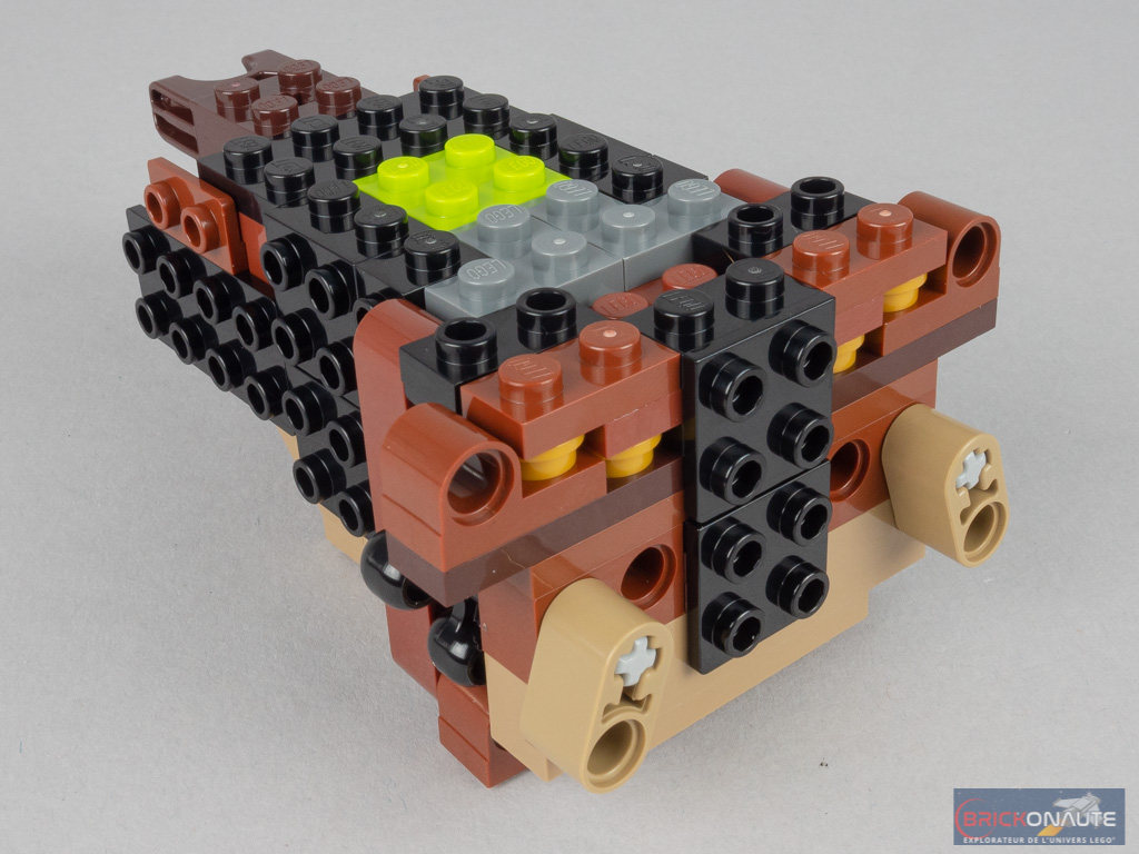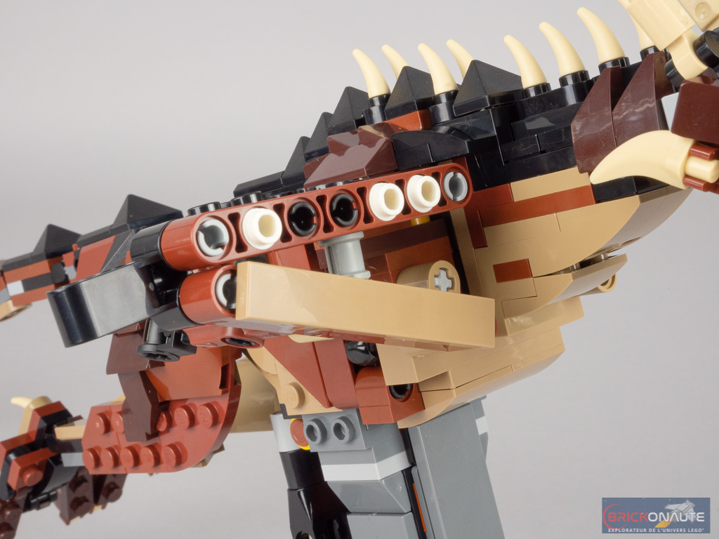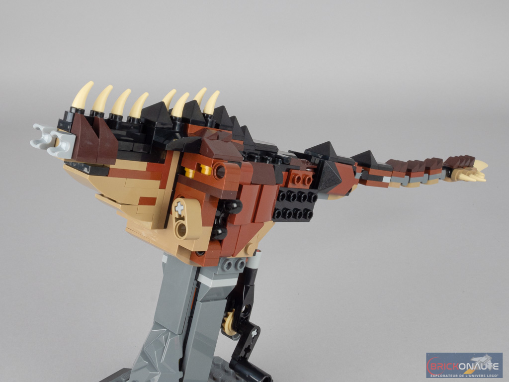 La réalisation est soignée, l’animal est imposant pour une « petite » boîte, et les couleurs sont bien choisies. J’apprécie tout particulièrement les pointes de couleur tan, qui tranchent avec le reste du corps nettement plus foncé. Le mélange dark brown / reddish brown fonctionne bien, je regrette par contre une nouvelle fois l’utilisation de ball joints gris pour la queue – particulièrement visibles étant donnée la finesse de celle-ci. Au bout de cette dernière, on retrouve bien l’une des caractéristiques principales de la bestiole : une grosse masse bardée de pointes, du plus bel effet.
