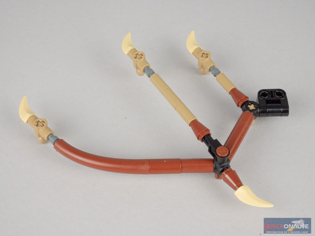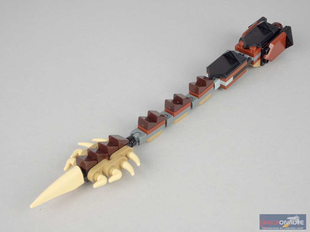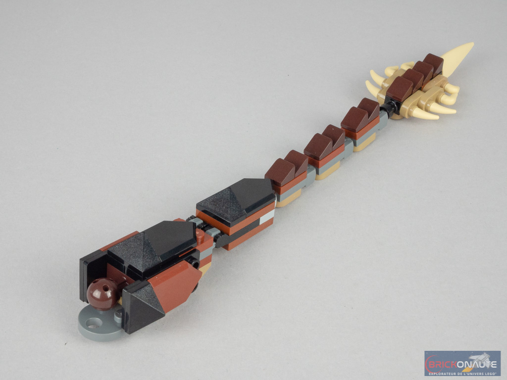 L’étape qui suit n’est pas des plus passionnantes : il s’agit d’assembler la queue, dont les différentes parties sont reliées entre elles par de vilains ball joints et charnières gris. Au bout, on retrouve l’extrémité imposante et bardée de pointes vue dans le film. Remarquez ici l’utilisation de cornes de vaches.