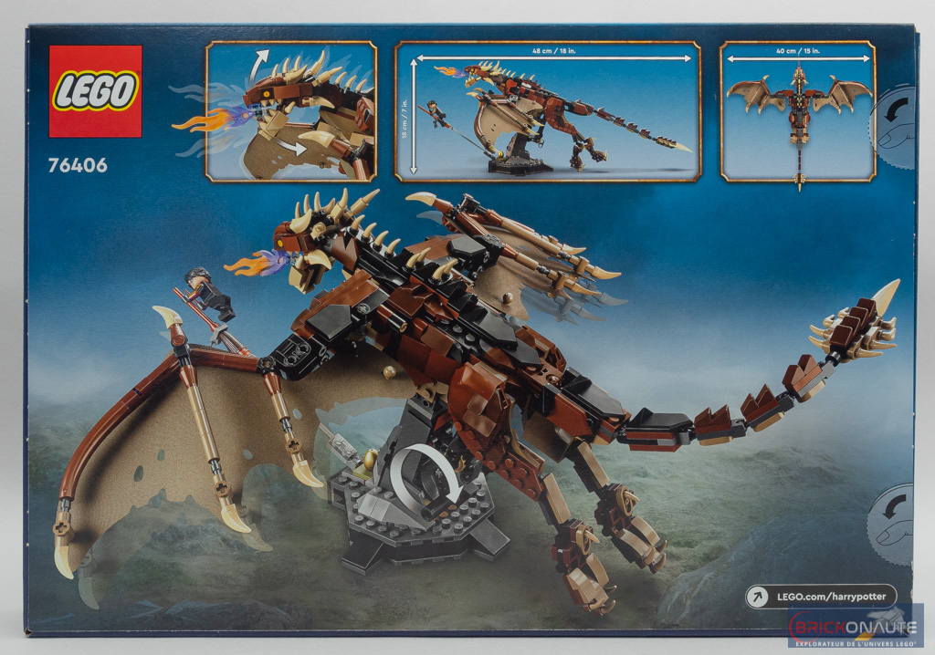 Sur la face avant de la boîte, notre dragon nous est présenté dans ce qui semble être l’arène vue lors du Tournoi des 3 Sorciers. Des flammes sortent de sa gueule, alors qu’il poursuit le pauvre Harry Potter attaché à son balai, fixé par une tige transparente au support. Au dos, la vue principale nous montre le dragon de dos, 3 vignettes en partie supérieure nous indiquent notamment les dimensions de l’ensemble : 48cm de long, pour 40cm d’envergure et 18cm de haut.