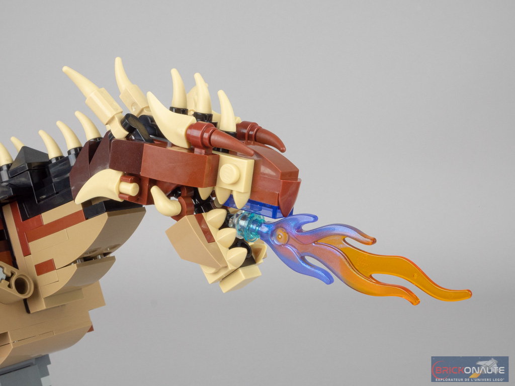 Si je trouve le corps et les pattes très réussies, je suis moins convaincu par la réalisation de la tête. Surtout au niveau de la mâchoire inférieure, qui paraît bien trop plate. Et par l’utilisation de deux autocollants pour les yeux. Avec seulement 3 autocollants (le troisième étant utilisé pour le nom de notre dragon sur son support), je crois que LEGO aurait pu faire l’effort de proposer des éléments tampographiés. La flamme bicolore est en revanche très jolie.