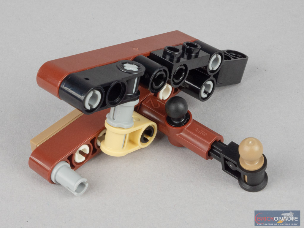 On ajoute ensuite quelques éléments sur le flanc gauche de la bestiole, puis on construit deux sous-ensembles. Le premier constitue la « cuisse » et le « mollet » – on retrouve une articulation à ce niveau avec une charnière à cliquet. Le second constitue la patte, elle aussi attachée au mollet sur une charnière. Les griffes sont fixées sur des clips et sont donc mobiles.