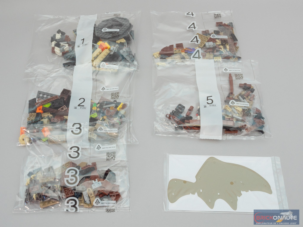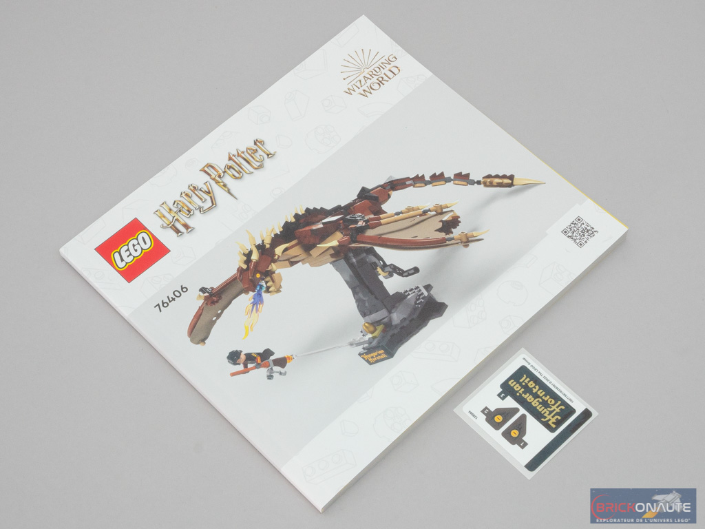 À l’intérieur, nous trouvons 5 sachets de pièces numérotés, et un sixième sachet contenant les 2 ailes du dragon ainsi qu’un insert en carton. La notice d’instructions compte 176 pages pour 310 étapes de construction. Enfin, on trouve également une petite planche de 3 autocollants : dommage de ne pas avoir tampographié si peu d’éléments ! D’autant que le précédent set de cette « collection », la référence 76394 Fawkes, Dumbledore’s Phoenix, n’en contenait pas un seul.
