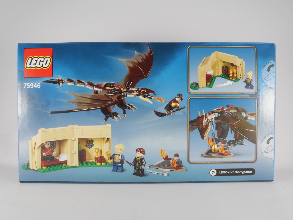 Sur l’avant de la boîte, Harry est sur son balai en train d’essayer de voler l’oeuf d’or gardé par le Magyar à Pointes. Les autres concurrents du Tournoi des Trois Sorciers (Cédric Diggory, Victor Krum et Fleur Delacour) brandissent leurs baguettes au pied d’une tente. Au dos, on découvre l’intérieur de celle-ci et deux autres vignettes : la première nous montre que la tente est articulée sur une charnière et peut être ouverte ou fermée ; la seconde offre une vue plus rapprochée du dragon, enchaîné.