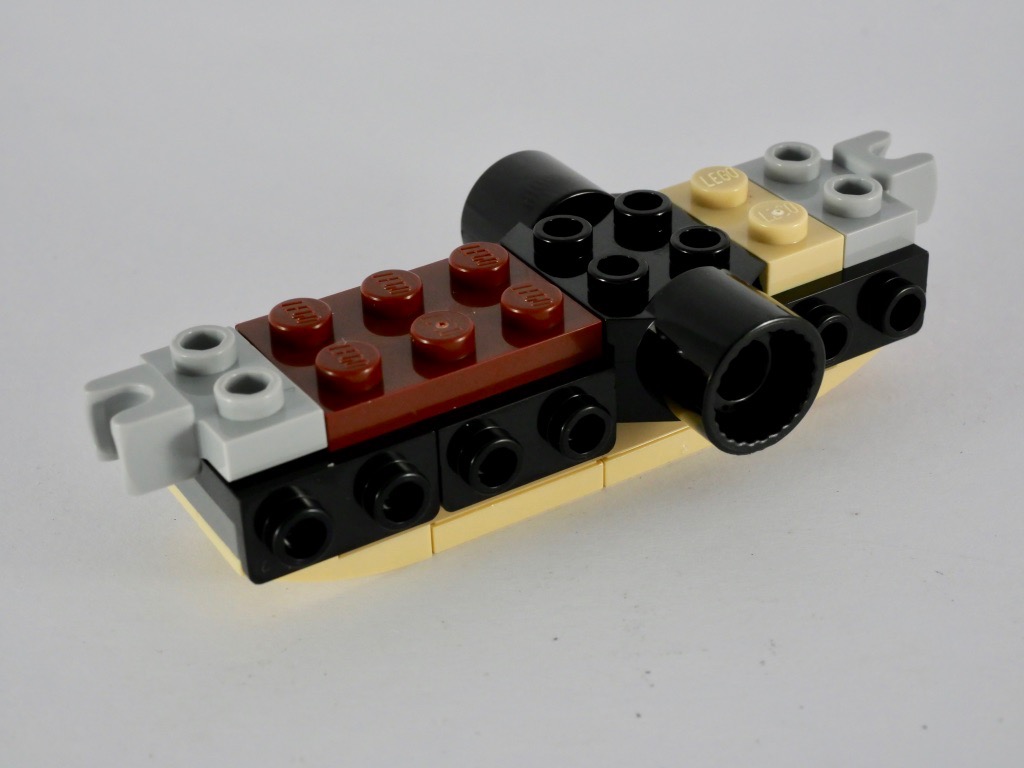 Nous commençons avec la construction du dragon. Son corps est basé sur une plate de 2×6 tenons, que l’on vient prolonger puis habiller grâce à des briques SNOT (pour Studs Not On Top, se dit des briques qui disposent de tenons sur les côtés). Deux ball joints sont disposés à l’avant et l’arrière pour recevoir la tête et la queue. Une Brick 2X2 W. D. Klick-Female recevra pour sa part les deux pattes.