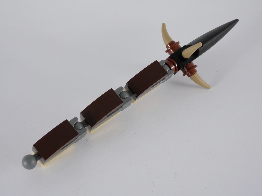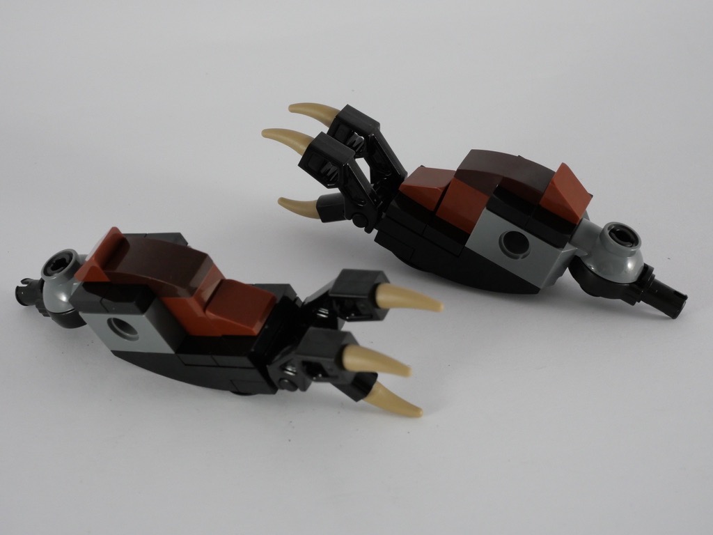 On construit alors la queue, constituée de 4 éléments articulés entre eux par des ball joints, qui lui donnent cet aspect un peu « squelettique ». On passe aux deux pattes qui disposent chacune de 3 griffes articulées, puis à la tête. Une flamme, fixée par un clip à l’intérieur de celle-ci, s’en dégage. Il en résulte cependant le fait que l’animal ne peut pas fermer la bouche complètement. On termine le dragon en lui fixant ses ailes.