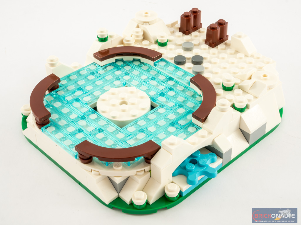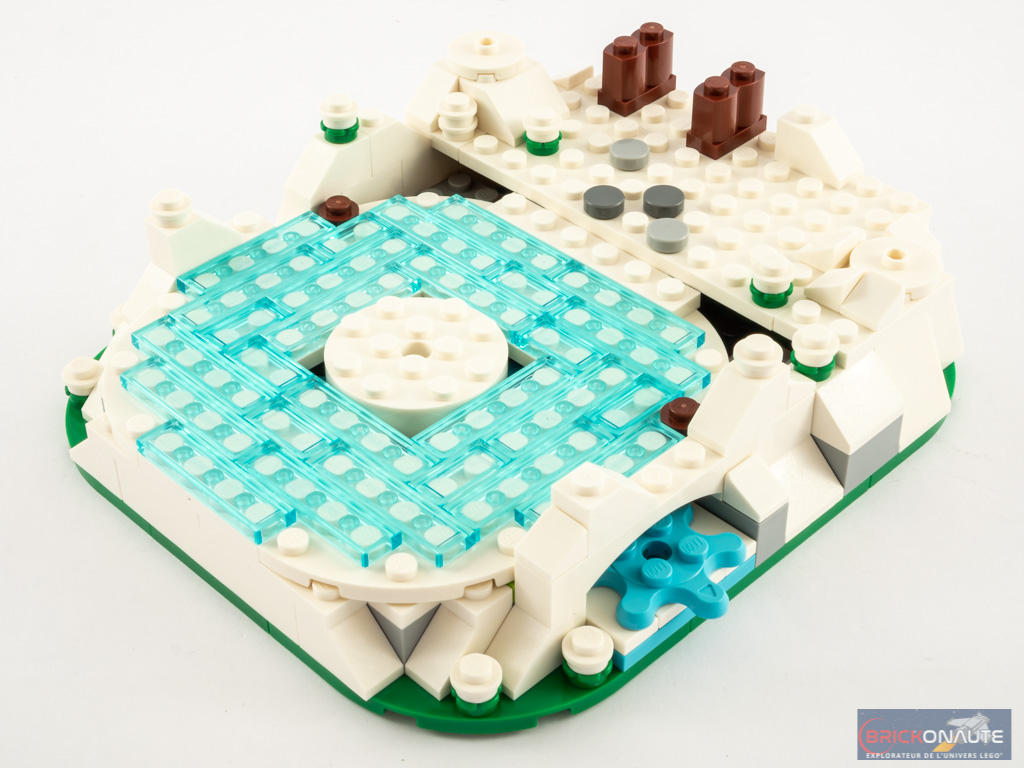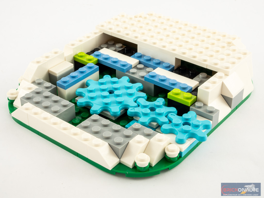 La construction commence en toute logique par la base, constituée d’une juxtaposition de plates vertes. On monte quelques pièces blanches sur les côtés, pour prendre un peu de hauteur mais également pour dissimuler le mécanisme qui permettra la rotation de nos patineurs. Celui-ci est constitué de 3 Gear Wheel dans la base, dont une dépasse sur le côté afin de pouvoir actionner le système. Une fois ces 3 engrenage en place, nous recouvrons la patinoire de « glace » avec deux sous-assemblages blancs couverts de tiles bleues translucides.