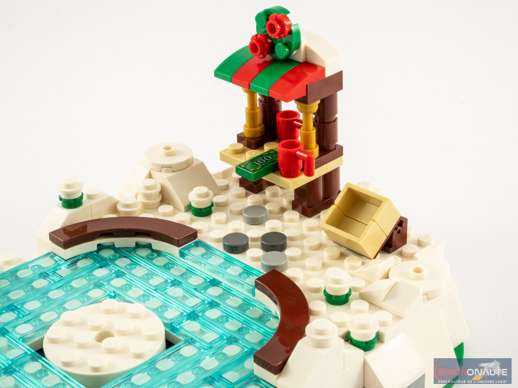 Mais non content de nous proposer une fonctionnalité bien pensée, ce petit set est également très réussi dans son design. De la glace de la patinoire bleue translucide avec ses rambardes en bois, jusqu’au petit comptoir pour tailler une bavette en passant par les petits arbres de Noël, il ne manque pas grand-chose au tableau. La finesse du design est également au rendez-vous et digne de ce que LEGO nous propose habituellement dans ses sets destinés à un public adulte.