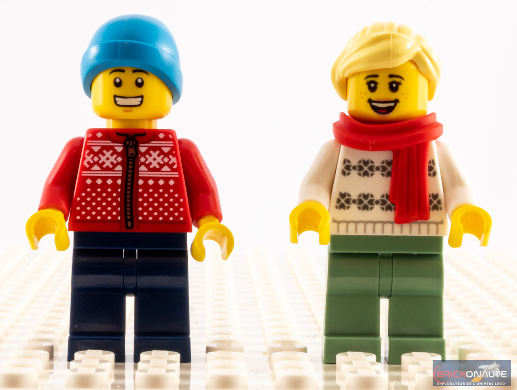 Si vous aimez les minifigs, vous serez également heureux (ou pas !) d’apprendre que les torses des deux personnages avec leurs pulls de Noël sont inédits. Inédits, et bien réalisés ! Les pantalons / têtes et couvre-chefs sont plus courants, même si on notera l’écharpe rouge encore assez peu répandue.