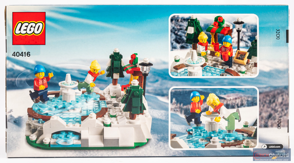 La petite boîte au format allongé reprend le design auquel LEGO nous a habitués ces dernières années, avec le petit bandeau rouge portant la mention « Edition Limitée » dans le coin supérieur droit. Sur la face avant, les deux minifigs sont en train de patiner – quelques flèches nous indiquent la manière de fonctionner du modèle. Au dos, on retrouve nos deux minifigs dans l’image principale, tandis que deux vignettes nous proposent deux autres mises en scène.