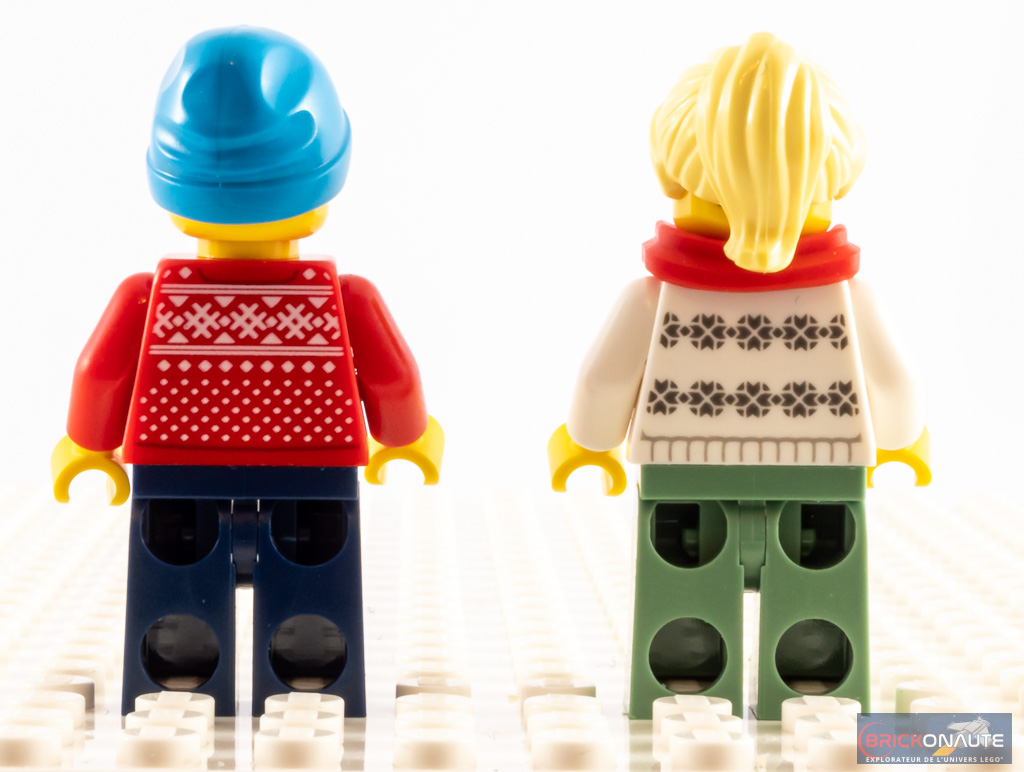 Voilà qui devrait aiguiser l’appétit des collectionneurs : les pulls de Noël des deux minifigs sont (du moins pour le moment) exclusifs à ce petit set promotionnel. Et ils sont fort réussis, qu’il s’agisse du gilet rouge à zip ou du pull-over blanc. La tampographie est fine et soignée, c’est franchement joli.