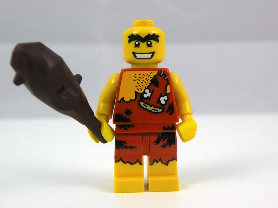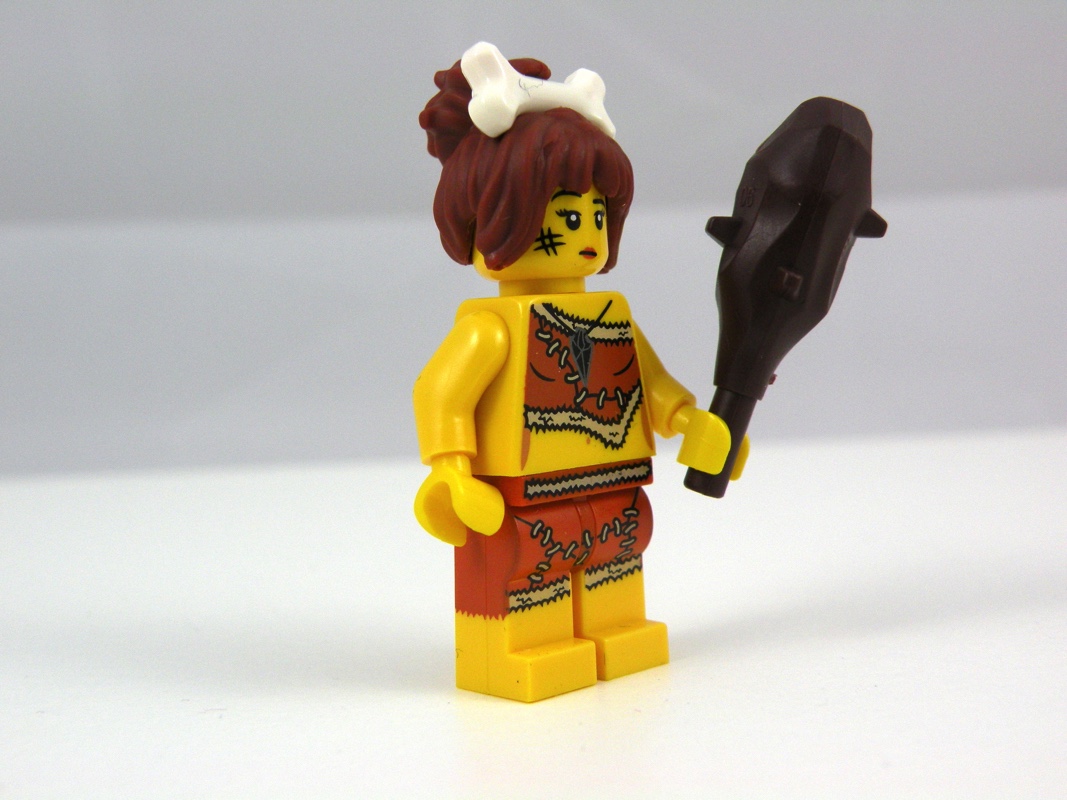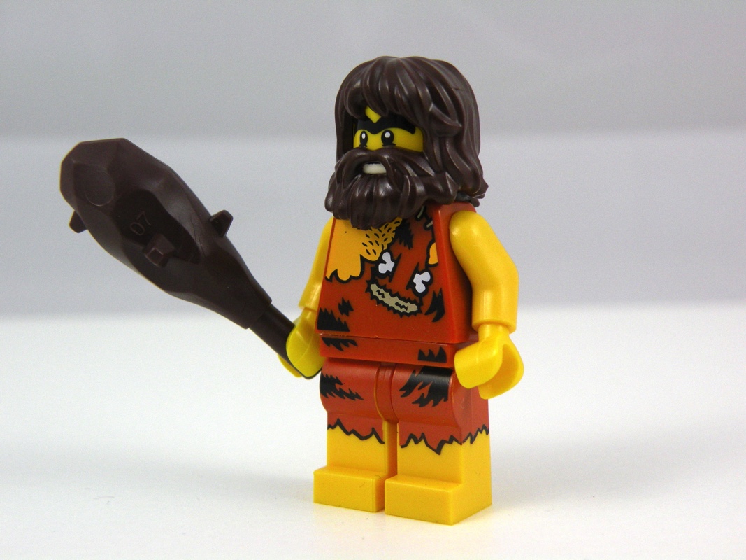 On trouvait initialement, dès la première série de minifigs à collectionner (8683), un homme de cro-magnon dans le style de notre Caveman. Cette nouvelle version le présente dans une peau de bête plus sombre que la version précédente, la tête planquée sous sa barbe étant la même, mais la barbe étant également une nouveauté de cette minifig, ici présentée en dark brown. On regrettera amèrement que le dos ne soit absolument pas traité, alors que le reste de la tampographie est plutôt soigné, avec par exemple le petit os qui dépasse sur le torse et le « pantalon » déchiré laissant apparaître les pieds nus. Il porte en guise d’accessoire un gourdin, également en dark brown.