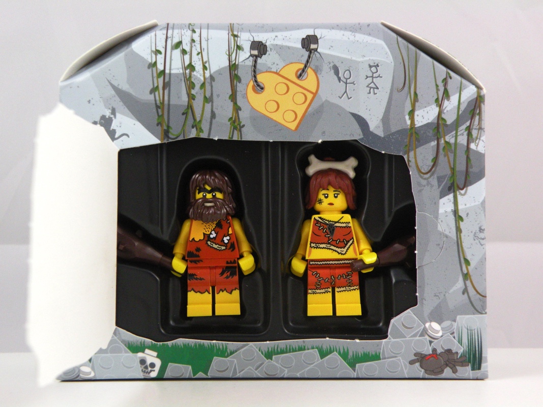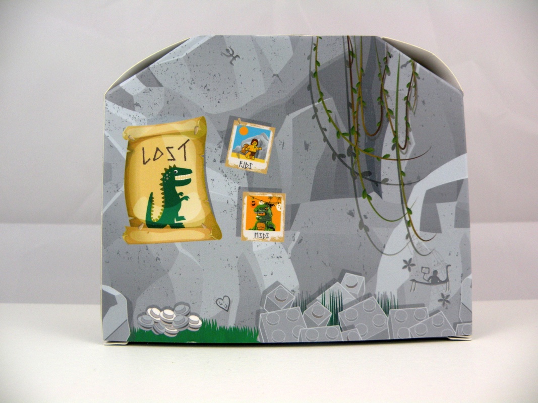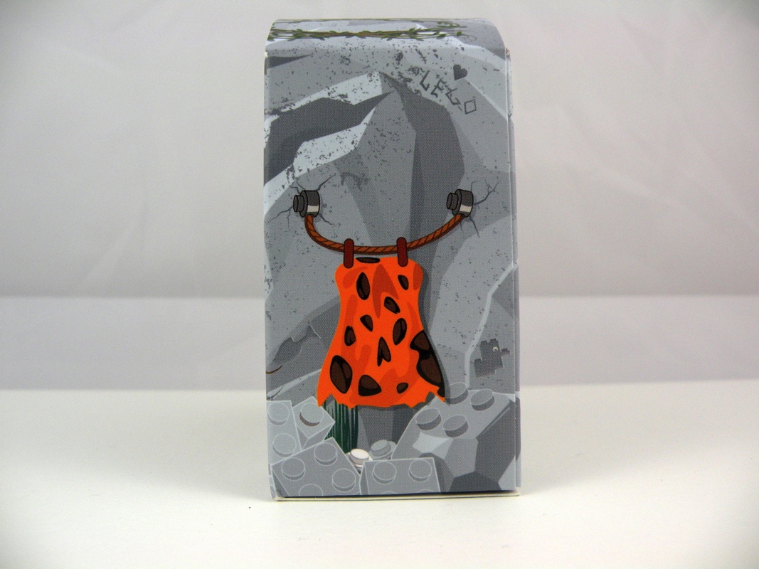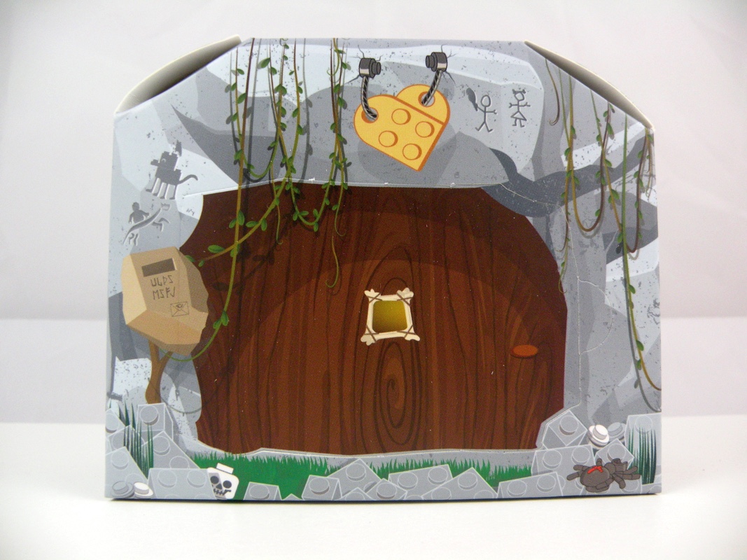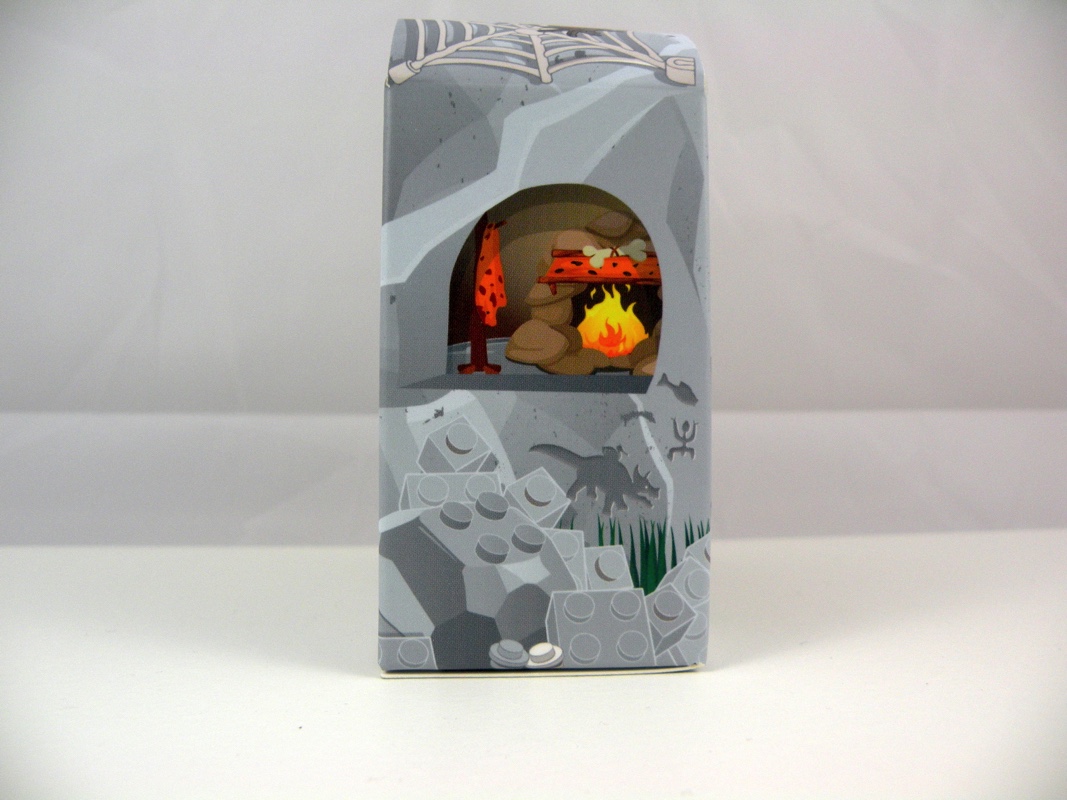 La face avant présente une porte en bois sur au dessus de laquelle on retrouve un cœur attaché à l’aide d’une corde, mais également une boîte aux lettres en pierre et des lianes qui viennent pendre devant. L’arrière de la boîte représente une affiche de leur animal de compagnie disparu (un dinosaure !), ainsi que ce qu’on peut interpréter comme des photos de vacances. Sur un des côtés on trouve la robe de madame en train de sécher, tandis que de l’autre on voit l’intérieur de la grotte avec sa cheminée et son porte-manteau. Sur toute la partie basse sont représentées des briques LEGO grises en guise de roches, et une toile d’araignée vient décorer le haut de la boîte. Étonnamment, c’est un des points forts de ce mini-set, avec sa petite touche d’humour bien pensée, et sa réalisation très soignée dans un carton d’aspect « glacé ».