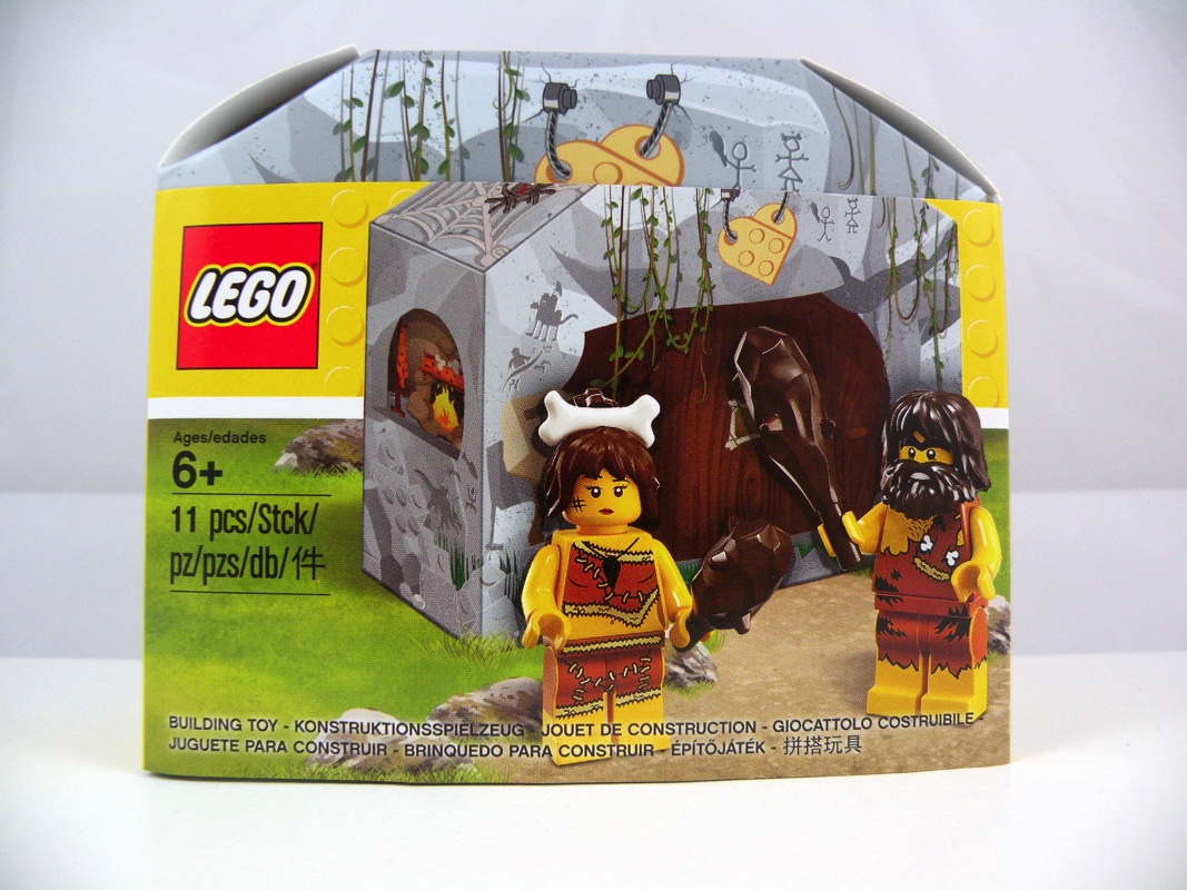 La face avant présente une porte en bois sur au dessus de laquelle on retrouve un cœur attaché à l’aide d’une corde, mais également une boîte aux lettres en pierre et des lianes qui viennent pendre devant. L’arrière de la boîte représente une affiche de leur animal de compagnie disparu (un dinosaure !), ainsi que ce qu’on peut interpréter comme des photos de vacances. Sur un des côtés on trouve la robe de madame en train de sécher, tandis que de l’autre on voit l’intérieur de la grotte avec sa cheminée et son porte-manteau. Sur toute la partie basse sont représentées des briques LEGO grises en guise de roches, et une toile d’araignée vient décorer le haut de la boîte. Étonnamment, c’est un des points forts de ce mini-set, avec sa petite touche d’humour bien pensée, et sa réalisation très soignée dans un carton d’aspect « glacé ».