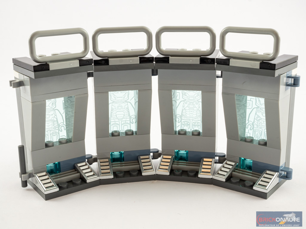 Le set se veut être une extension du set 76125 Iron Man Hall of Armour sorti l’année dernière. Et à ce titre, ça fonctionne : les 4 « modules » de l’armurerie sont rigoureusement identiques et donc compatibles. Au niveau du design cela reste très sommaire, mais les collectionneurs apprécieront cette nouvelle manière de présenter les différentes minifigs en leur possession.