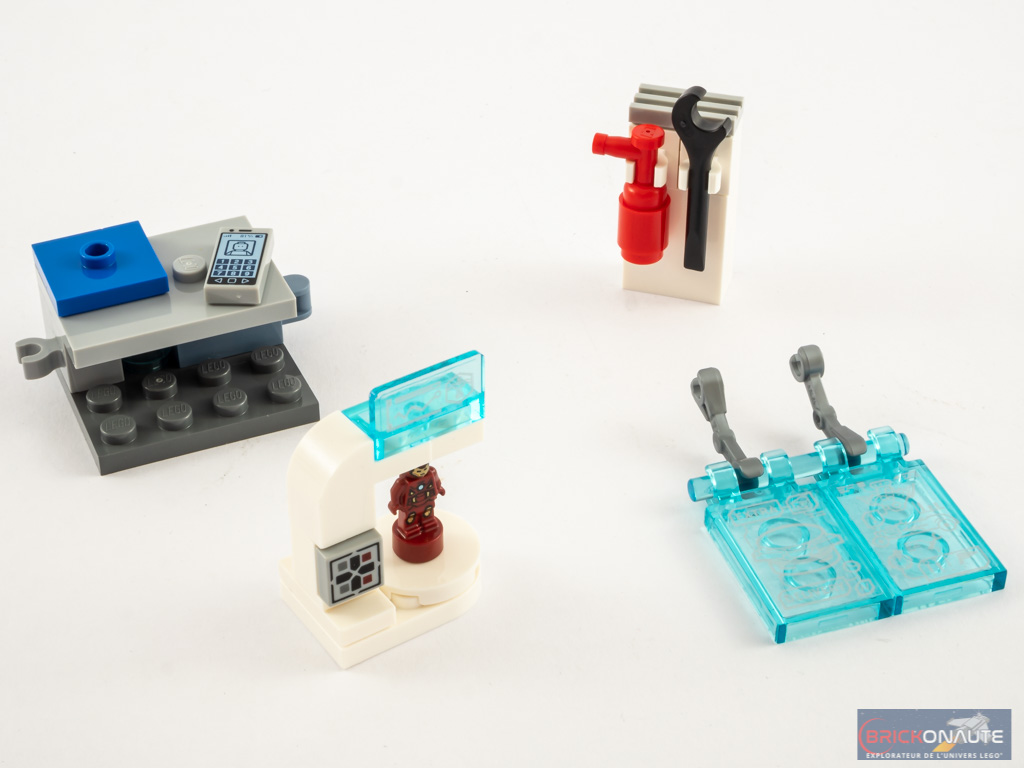 Avec le sachet portant le numéro 2 nous construisons l’armurerie à proprement parler. Et cette construction commence par 4 modules identiques, à la vitre arrière près : les 4 modules sont décorés du schéma d’une armure différente d’Iron Man. C’est assez répétitif et pas très intéressant, et il faudra faire bien attention lors du collage des stickers sur les grandes pièces bleues translucides. Au bout de ces 4 modules, on en rajoute un petit cinquième sous la forme d’un bureau avec un téléphone et la micro-fig d’Iron Man. On termine avec quelques accessoires : deux écrans clipsés sur des bras de robots, un extincteur et une clef plate.