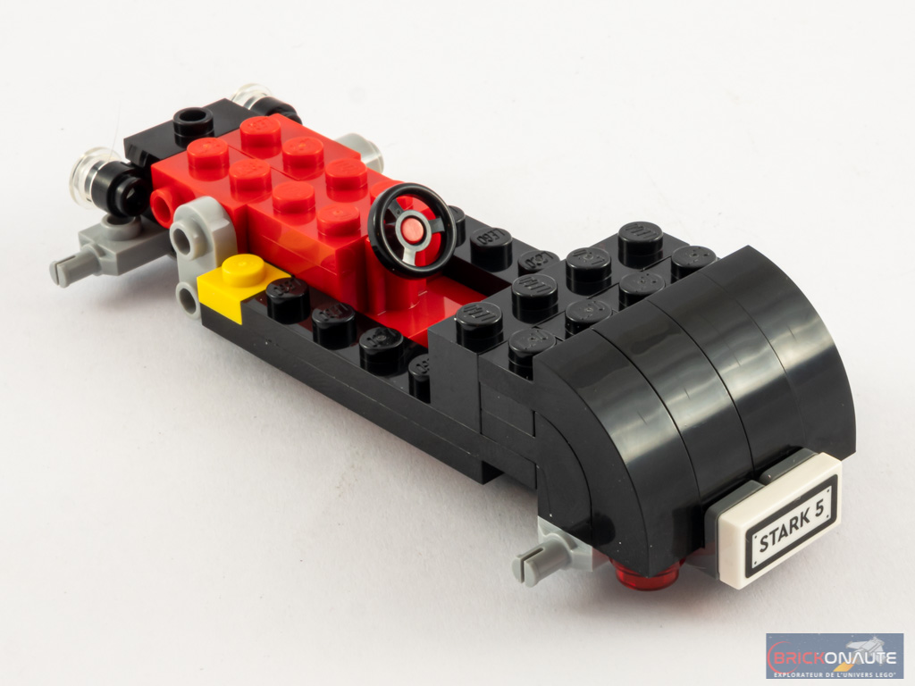 Nous nous occupons ensuite du Ford Flathead Roadster de 1932, le Hot-Rod de la collection de Tony Stark. Il se base sur le châssis habituel des petits véhicules LEGO City et est assemblé en un petit quart d’heure. La construction est simple et consiste en quelques slopes à l’arrière, deux panels sur les côtés pour les portières, un petit moteur brick-built basé sur des charnières et des feux avants / feux stops représentés par des round plates transparentes. Les roues sont de tailles différentes à l’avant et à l’arrière et offrent au véhicule un look assez sympa.