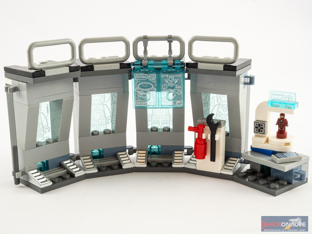 Le set se veut être une extension du set 76125 Iron Man Hall of Armour sorti l’année dernière. Et à ce titre, ça fonctionne : les 4 « modules » de l’armurerie sont rigoureusement identiques et donc compatibles. Au niveau du design cela reste très sommaire, mais les collectionneurs apprécieront cette nouvelle manière de présenter les différentes minifigs en leur possession.