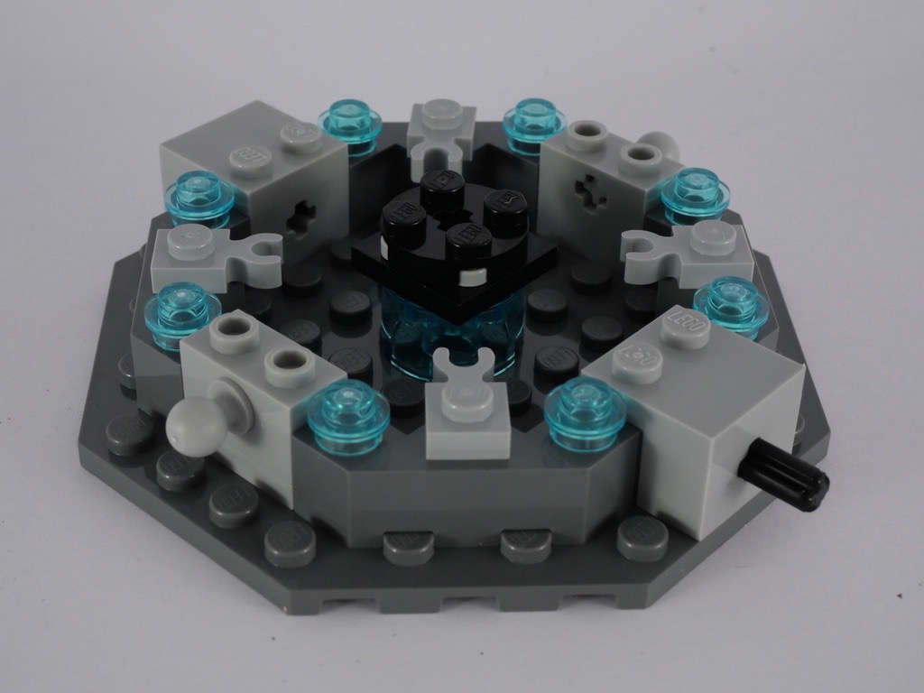 On le termine avec l’assemblage de la plateforme centrale. Le dish bleu translucide est posé sur une turntable : il est donc possible de le tourner comme on le souhaite. Deux bras, articulés sur des clips, permettent d’aider Tony Star à s’habiller.
