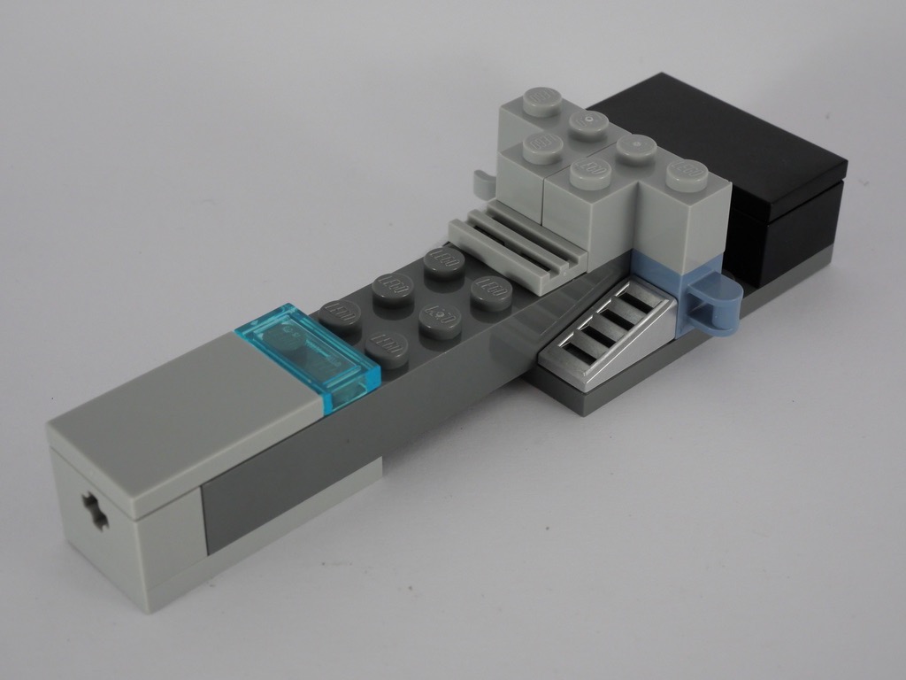 Le deuxième sachet commence avec l’assemblage de 4 (!) modules supplémentaires, à accoler aux 3 précédents. On ajoute ensuite quelques décorations supplémentaires : un jetpack, des outils, un stud-shooter et une parabole.