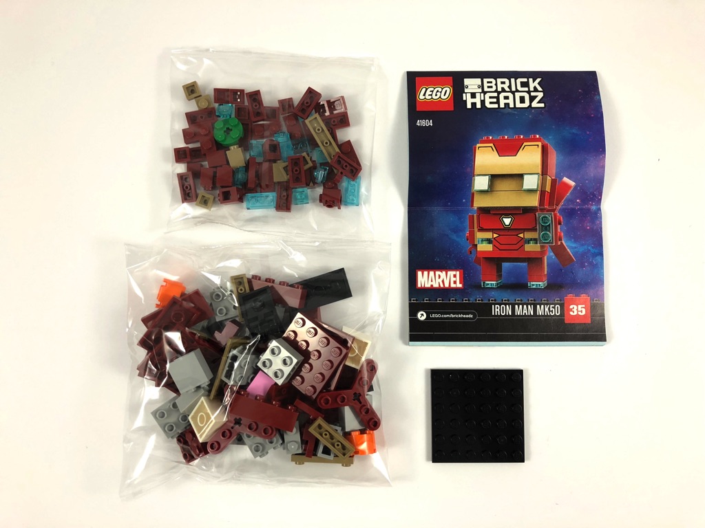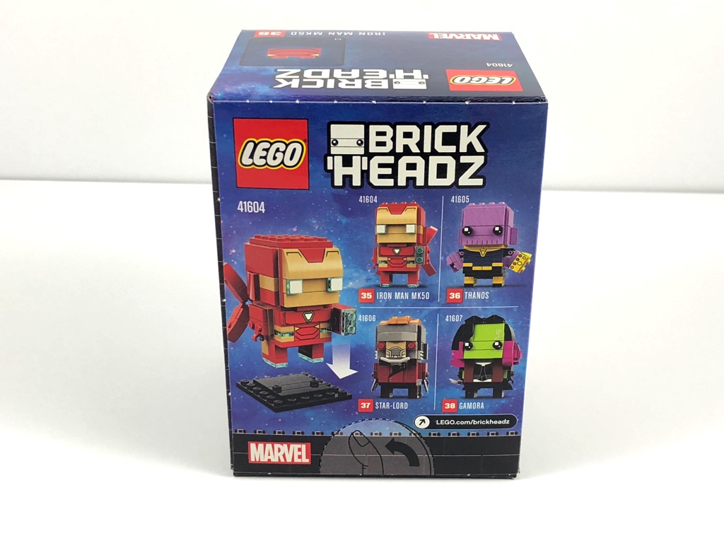 Une petite boîte au format standard pour la gamme, sur laquelle on trouve à l’avant Iron Man dans sa version MK50, présenté sans son socle d’exposition sur un fond étoilé. On trouve également le logo de la gamme, le logo Marvel, et le numéro de cette BrickHeadz : 35. Sur le côté, le « vrai » héros Marvel est en photo, au dessus du logo du film Avengers: Infinity War. Sur l’arrière, il est représenté sur son socle aux côtés de ses trois comparses sortis en même temps que lui : les sets 41605 – Thanos, 41606 – Star-Lord et 41607 – Gamora.