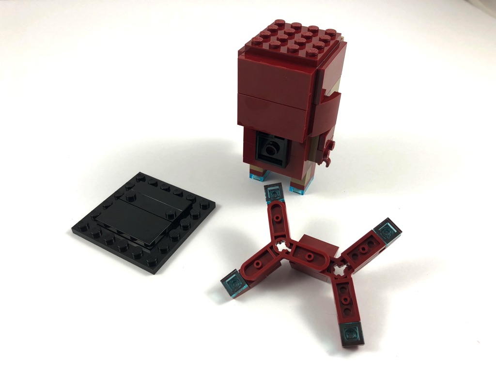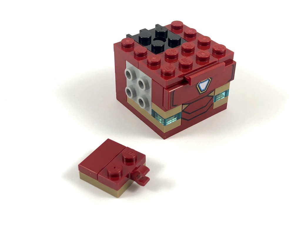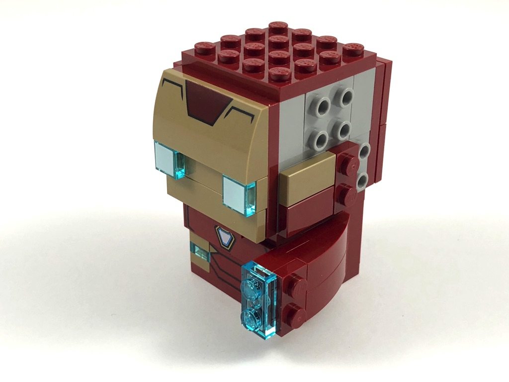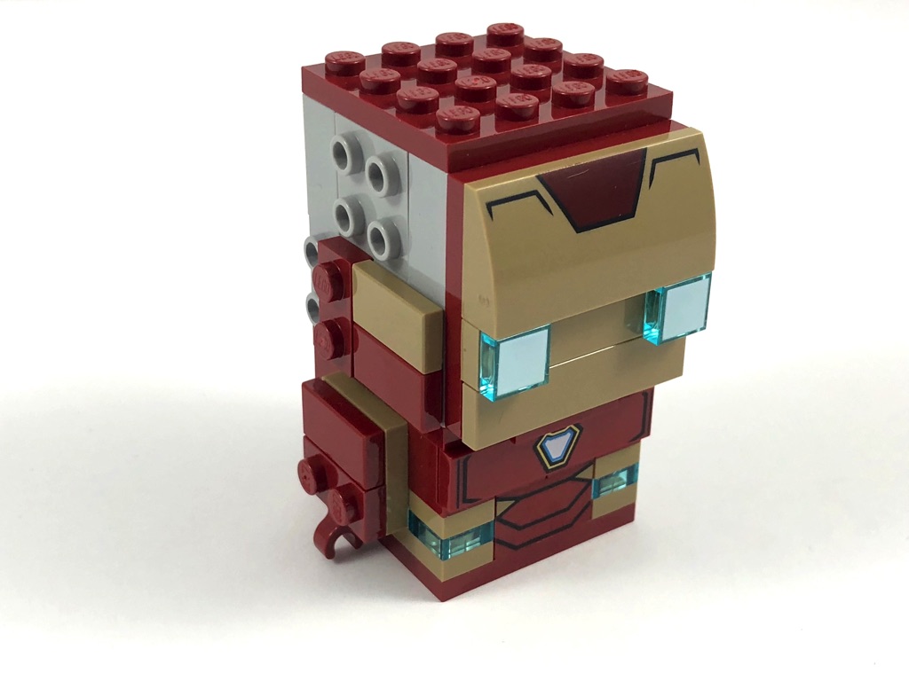 La structure interne de la tête est identique à celle trouvée dans la plupart des autres BrickHeadz, composée de 12 briques SNOT et de la sempiternelle brique rose 2×2 à l’intérieur. Commence alors l’habillage de celle-ci, cette fois en couleur dark tan, contre bright light orange pour la première version. Ca « flashe » moins et personnellement je préfère. Les yeux carrés en trans blue, tampographiés d’un carré blanc sont identiques à ceux du set 41590. La face réalisée, on décore le côté droit puis l’arrière, avant de construire le bras gauche d’Iron Man. Au vu de la photo sur le côté de la boîte, ça semble plutôt ressemblant, le bout du bras d’Iron Man s’ « ouvrant » pour libérer un gros projectile lumineux.