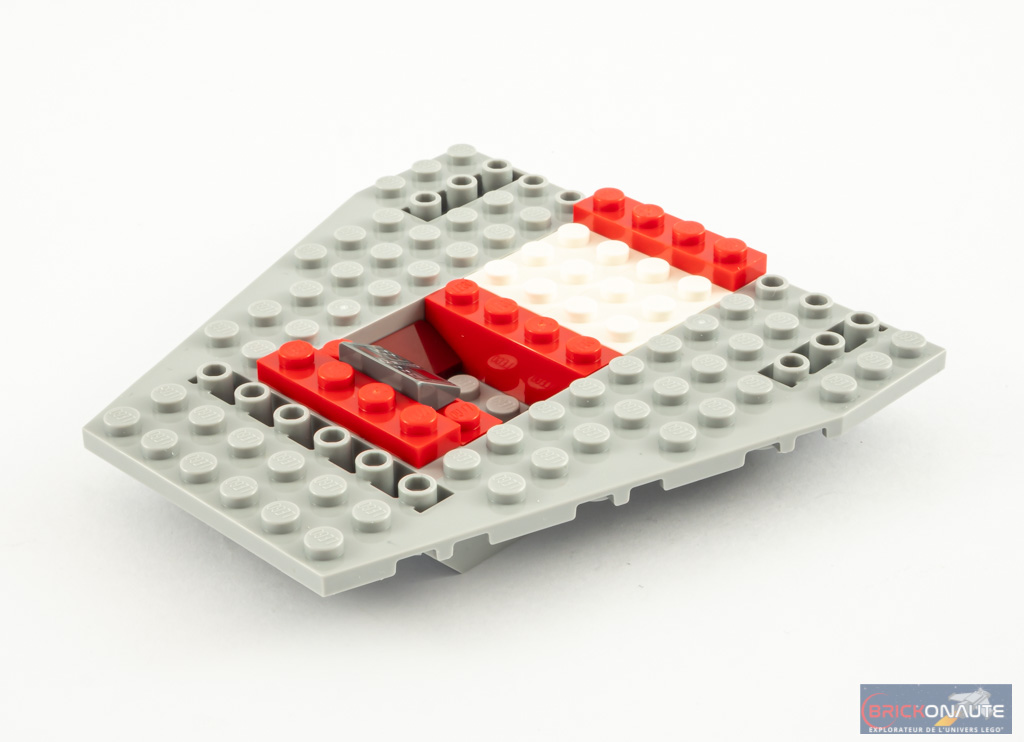 Le vaisseau se base sur une grosse méta-pièce, déjà utilisée dans 3 autres sets dont, par exemple, la référence LEGO Star Wars 75247 Rebel A-Wing Starfighter. On aménage le cockpit avec des slopes dont une tampographiée puis on empile quelques briques pour donner sa forme au vaisseau. On remarquera ici (ce n’était pas le cas dans le petit set LEGO Star Wars que j’ai pu tester) des briques SNOT à l’arrière. On y attache un moteur grâce à un pin Technic. Le « capot » est tampographié – rappelons qu’il n’y a jamais d’autocollants dans ces sets [4+]. Deux petites ailes sont clipsées sur les côtés.
