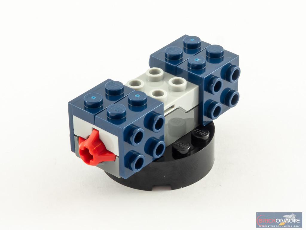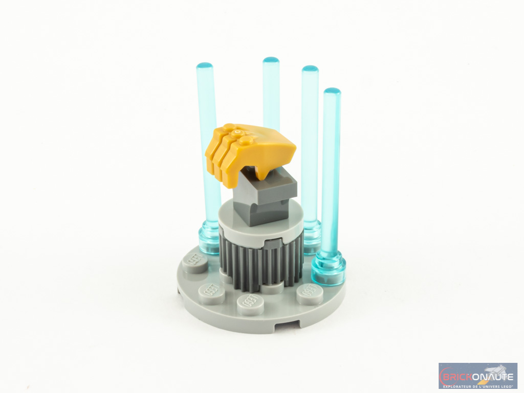La conception du canon chevauché par Thanos est également intéressante et fait aussi appel à des éléments SNOT, qu’on décore sur les deux côtés. La brique ronde qui supporte le shooter est fixée sur un pin Technic, le canon peut donc tourner sur sa base. Un appui sur l’élément rouge à l’arrière libère le projectile. La construction de notre modèle s’achève avec l’assemblage d’un présentoir, ou quelques rayons lasers protègent un gant de l’infini.
