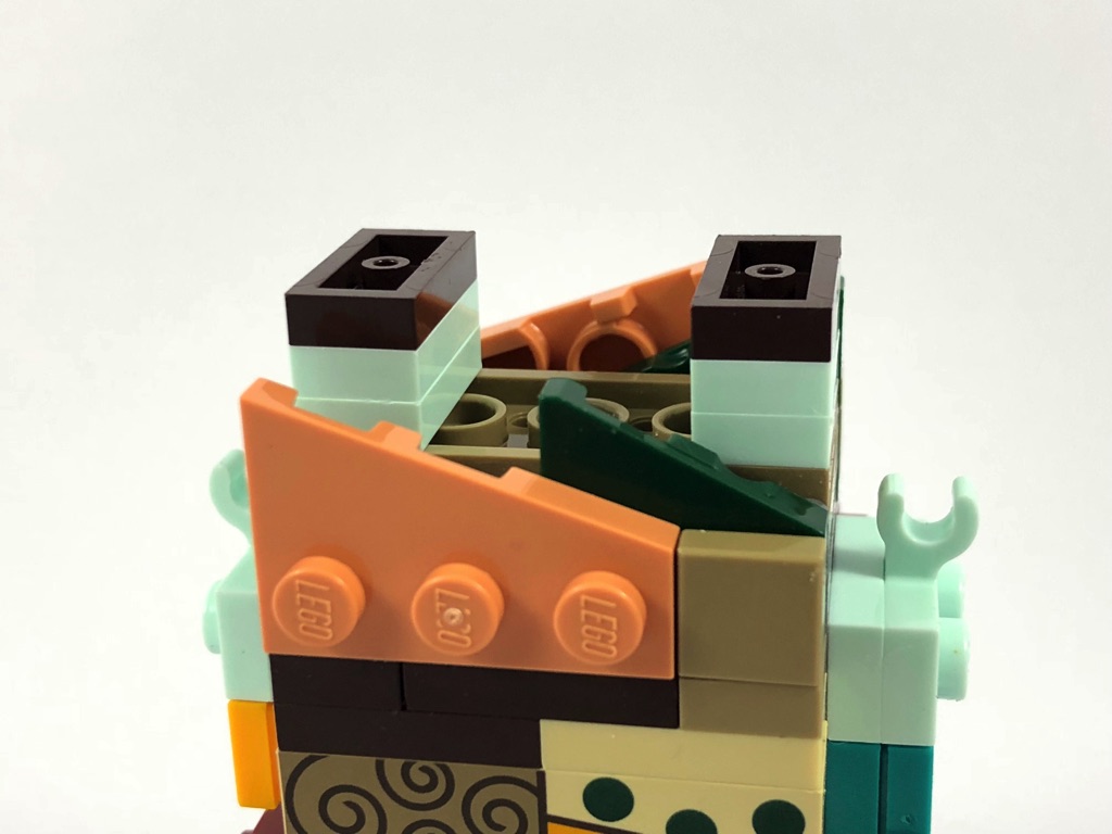 L’intérieur de la tête est également « standard », comme pour Jack : 12 briques SNOT, et le cerveau rose. On habille ensuite la face où l’on remarquera que les yeux sont soulignés d’une plate grise. La tampographie du front et de la bouche sont joliment réalisées.
