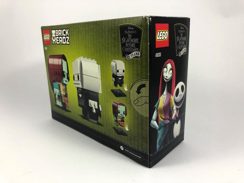 Sur l’avant de la boîte, les deux personnages nous sont présentés sur un fond vert olive, très légèrement de profil. Jack porte le numéro 74, et Sally le numéro 75 dans la gamme LEGO BrickHeadz. Sur le côté, on trouve une image des protagonistes tels qu’on peut les voir dans le film. Au dos, ils se font face, et sont également représentés au-dessus de leurs socles d’exposition.