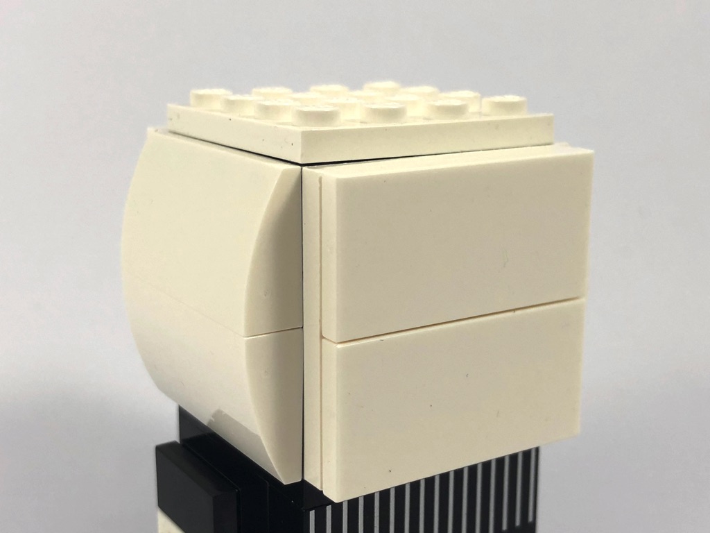 On termine avec la partie supérieure de la tête (constituée de quelques slopes incurvées) puis avec le socle d’exposition.