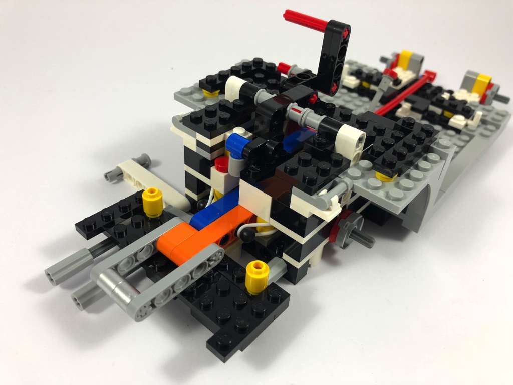 On habille ensuite ce châssis avec les bas de caisse, avant de se concentrer plus particulièrement sur l’arrière. Après avoir rallongé le châssis, on y assemble les différents mécanismes activant les fonctionnalités du modèle, dont la plus « impressionnante » d’entre elles : le siège éjectable. Elle est activée grâce à une manette présente sous le pare-choc arrière. Vous l’aurez compris : il s’agit certes d’un véhicule Creator Expert, mais il regorge de constructions intéressantes à base de pièces Technic.