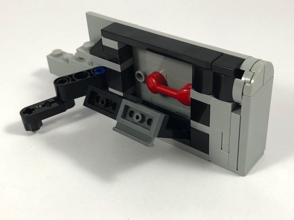 On continue avec l’habitacle. On vient y fixer l’écran rotatif (un sticker), actionné à l’aide d’un engrenage Technic. On ajoute ensuite le volant (qui n’actionne rien) et on ajoute le siège du chauffeur, à droite comme il se doit dans une voiture anglaise. La texture est bien reproduite à l’aide de briques « rebondies » (Brick, Modified 1 x 4 Log).
