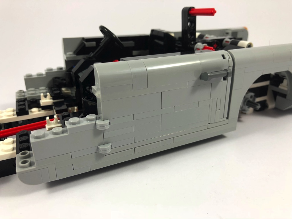 Il est temps à présent d’assembler les portières. La portière conducteur recèle un compartiment secret avec un téléphone, c’est assez sympathique. Celle du côté passager est identique, à ce compartiment près. On remarquera que les charnières dépassent sur le côté, ce n’est pas spécialement esthétique. Les sets 10248 – Ferrari F40 et 10252 – Volkswagen Beetle n’ont pas ce souci, les portières étant articulées sur des axes.