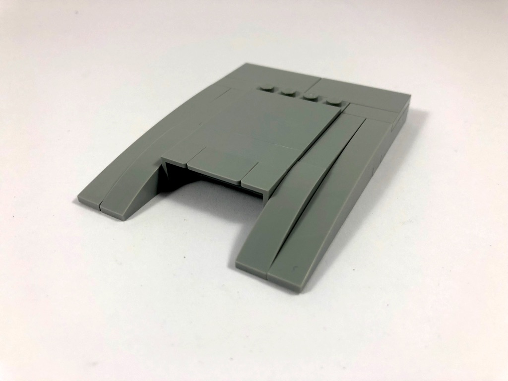 On passe ensuite à la seconde moitié des deux garde-boues arrière. Il s’agit pour l’essentiel de briques et plates grises agencées autour d’une arche. Deux trous sont laissés à l’arrière, on vient ensuite y fixer deux sous assemblages avec les feux.