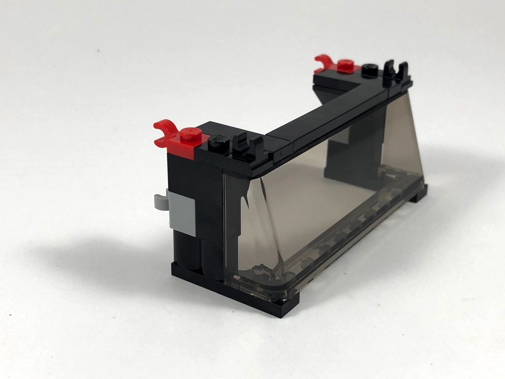 On assemble une première moitié du toit, fixée par des clips au pare-brise. La seconde moitié, mobile, est fixée au système d’éjection du siège passager. Siège que l’on construit juste après, avant de le poser sur l’axe Technic laissé dans l’habitacle.