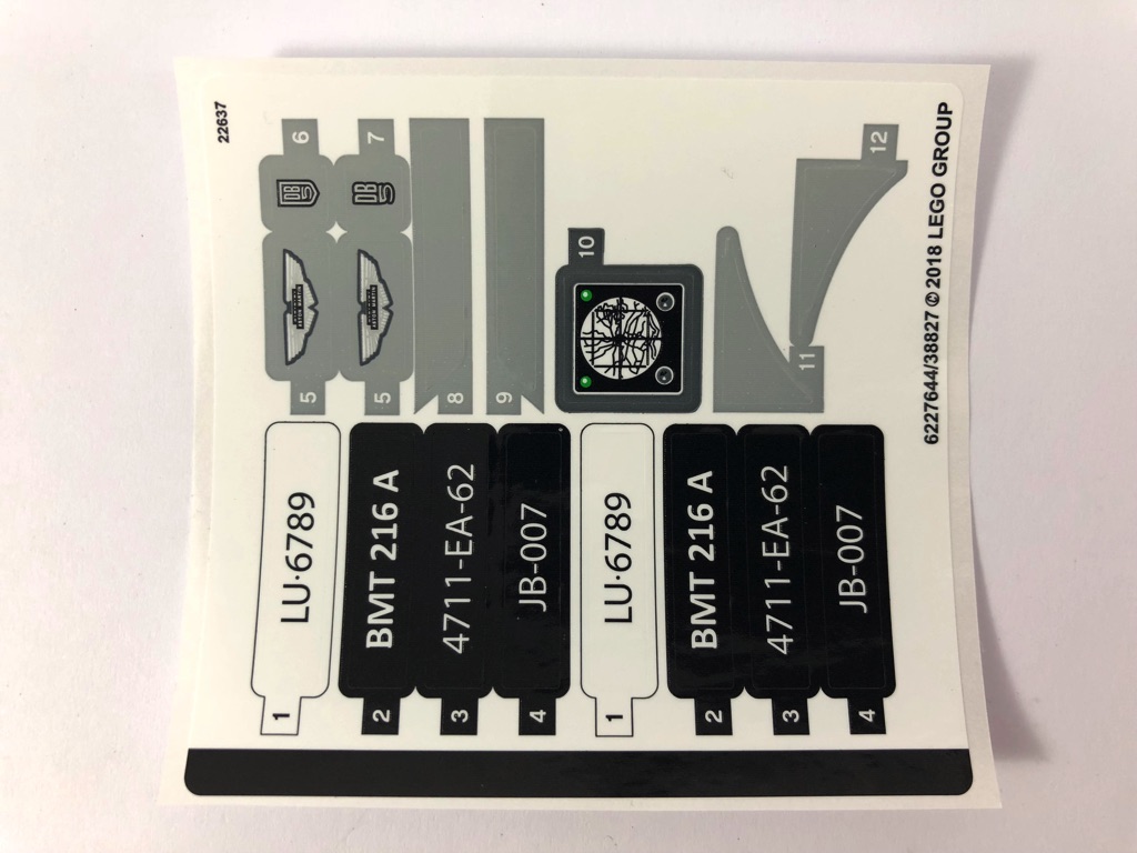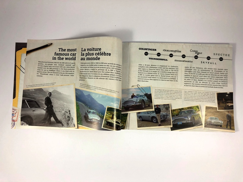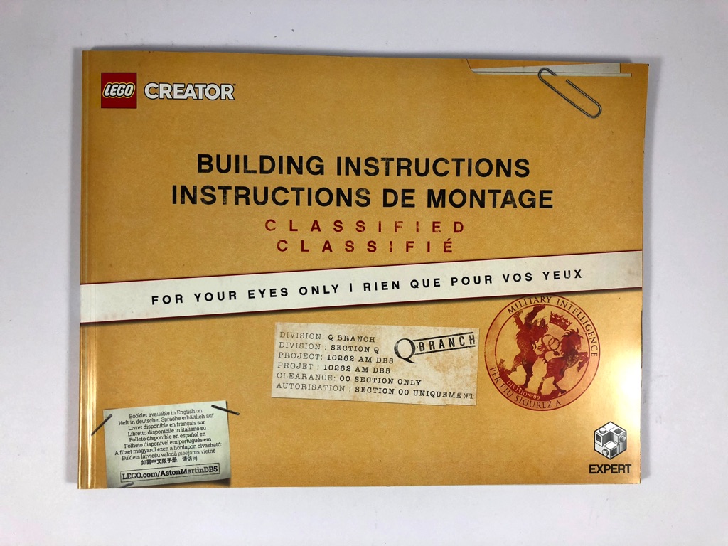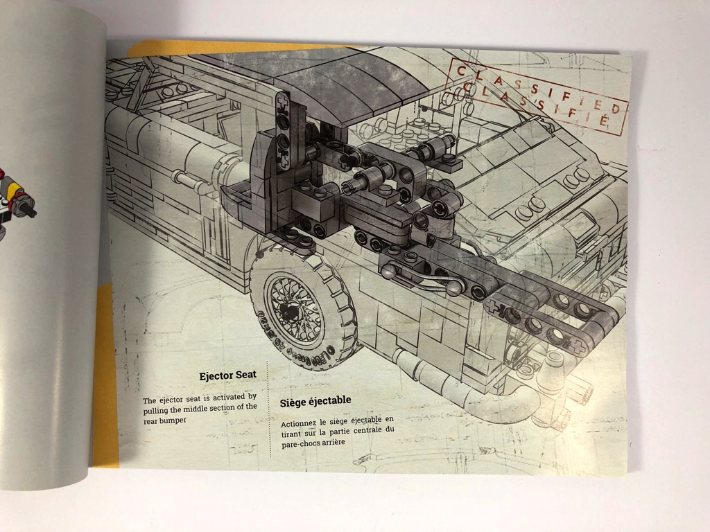 À l’intérieur, nous trouvons 12 sachets de pièces dont 11 numérotés de 1 à 4, le dernier contenant les pneus. La notice d’instructions est joliment présentée et compte 172 pages. On notera l’effort d’un double texte en anglais ET en français, avec notamment un bref historique des apparitions de la voiture dans la saga James Bond ou encore quelques répliques cultes, retrouvées dans les tweets ayant servi de teasing ces dernières semaines.