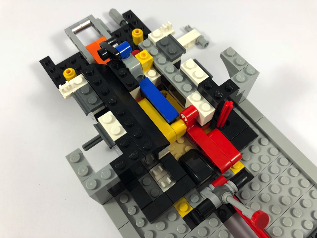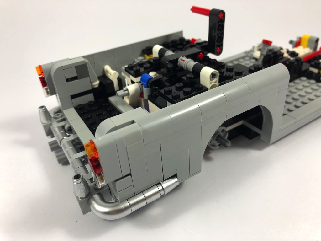 On habille ensuite ce châssis avec les bas de caisse, avant de se concentrer plus particulièrement sur l’arrière. Après avoir rallongé le châssis, on y assemble les différents mécanismes activant les fonctionnalités du modèle, dont la plus « impressionnante » d’entre elles : le siège éjectable. Elle est activée grâce à une manette présente sous le pare-choc arrière. Vous l’aurez compris : il s’agit certes d’un véhicule Creator Expert, mais il regorge de constructions intéressantes à base de pièces Technic.
