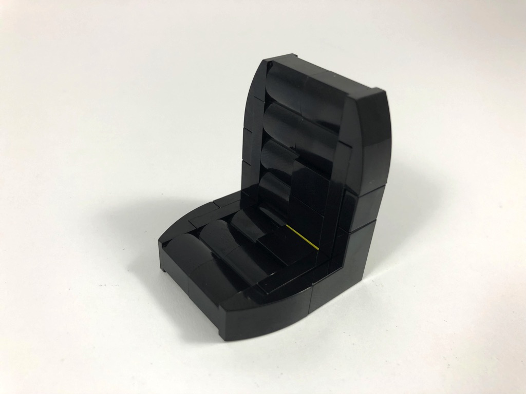 On assemble une première moitié du toit, fixée par des clips au pare-brise. La seconde moitié, mobile, est fixée au système d’éjection du siège passager. Siège que l’on construit juste après, avant de le poser sur l’axe Technic laissé dans l’habitacle.