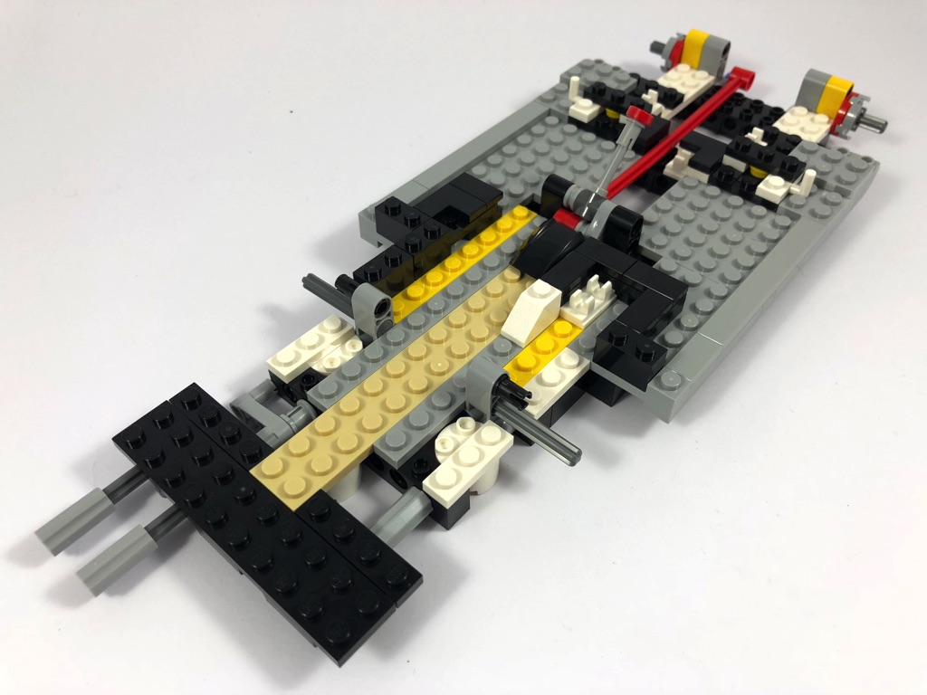 Il est ensuite temps de passer aux choses sérieuses, et de commencer à assembler notre voiture. Vous ne serez pas dépaysé si vous aimez les véhicules Creator Expert, du moins dans un premier temps. En effet, on commence par assembler le châssis, à base de cadres Technic. On y ajoute un premier mécanisme actionné par le levier de vitesse, mais j’y reviendrai plus tard.