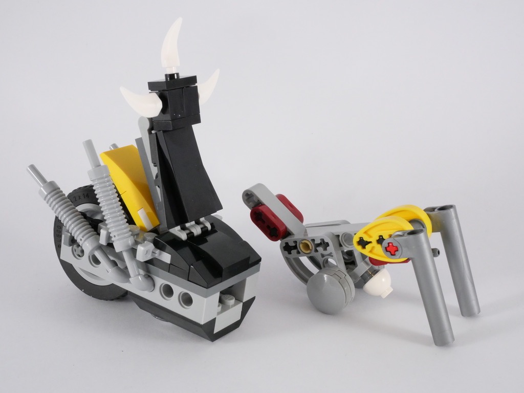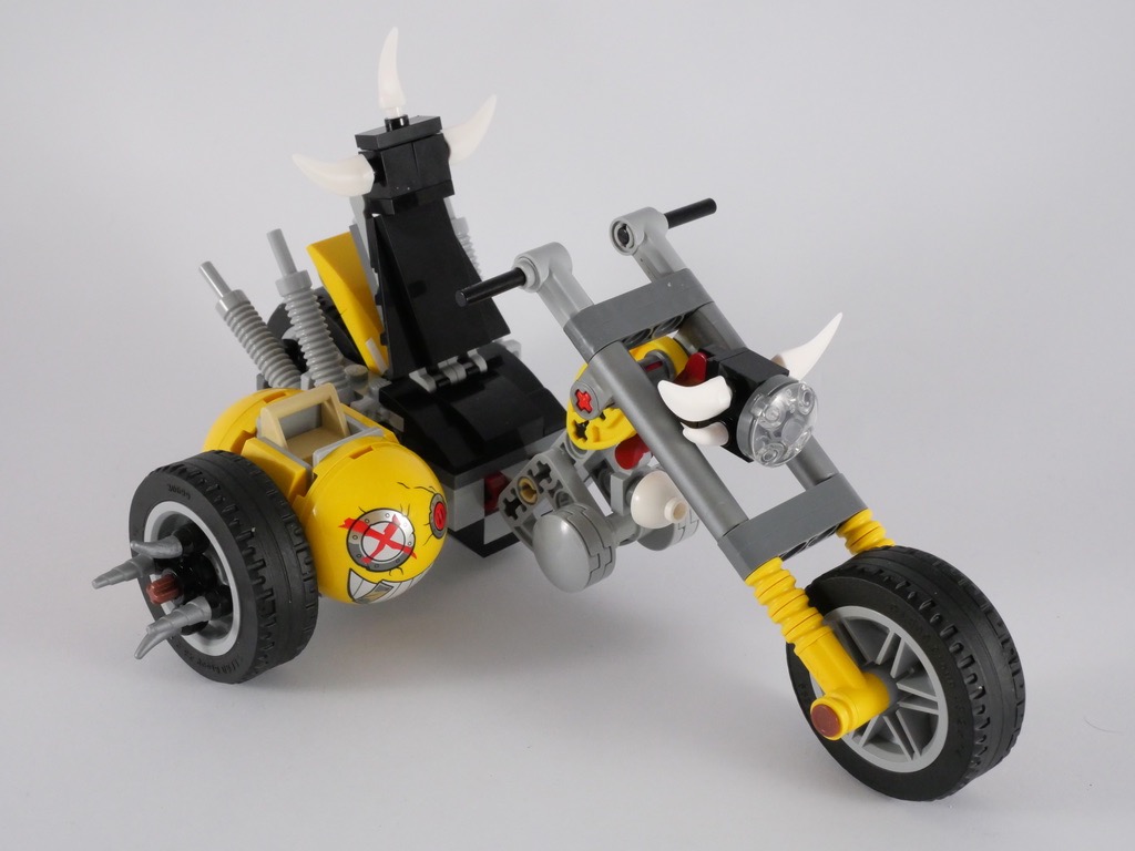 Après avoir assemblé les deux personnages, leurs armes et quelques accessoires, on attaque le vif du sujet avec la moto… pardon le chopper. On commence par l’arrière, où deux briques Technic maintiennent en place la roue. On y ajoute les échappements, puis le garde-boue. Nous passons ensuite à la selle, à commencer par son dossier, avant de construire un sous-ensemble comportant le cadre et une partie de la fourche. On ajoute alors la roue avant fixée au bout de deux grands axes Technic. Le guidon est assez simpliste, simplement composé de deux fines barres noires. On termine cette partie avant avec le phare, décoré de deux cornes de part et d’autre.