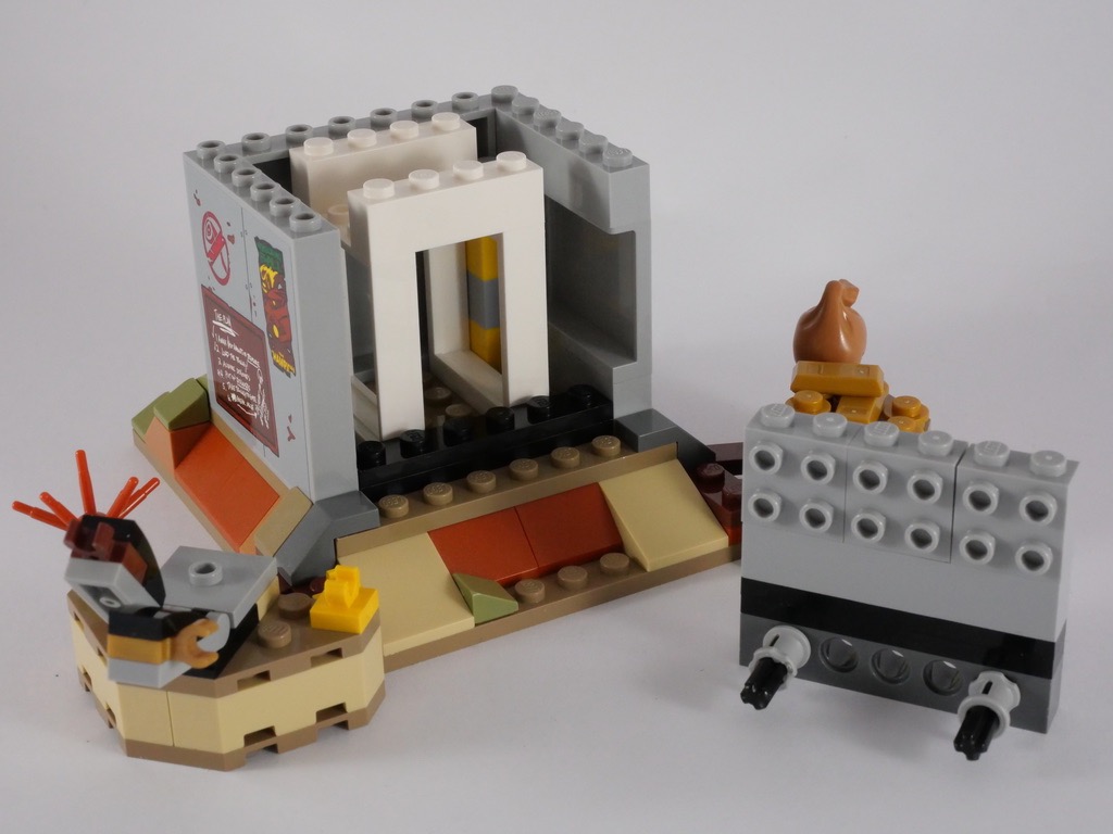 La construction du décor commence par une plate de 6×10 tenons que l’on décore de quelques pièces marron – beiges rappelant le désert de Junkertown. On la prolonge de part et d’autre de deux sous-ensembles. Le premier est décoré de roches, d’une plante séchée et de quelques clips qui permettront de fixer les armes des protagonistes si nécessaire. On trouve sur le second un paquet de pièces d’or et de lingots représentant l’objectif à atteindre dans le jeu vidéo : la chambre forte.