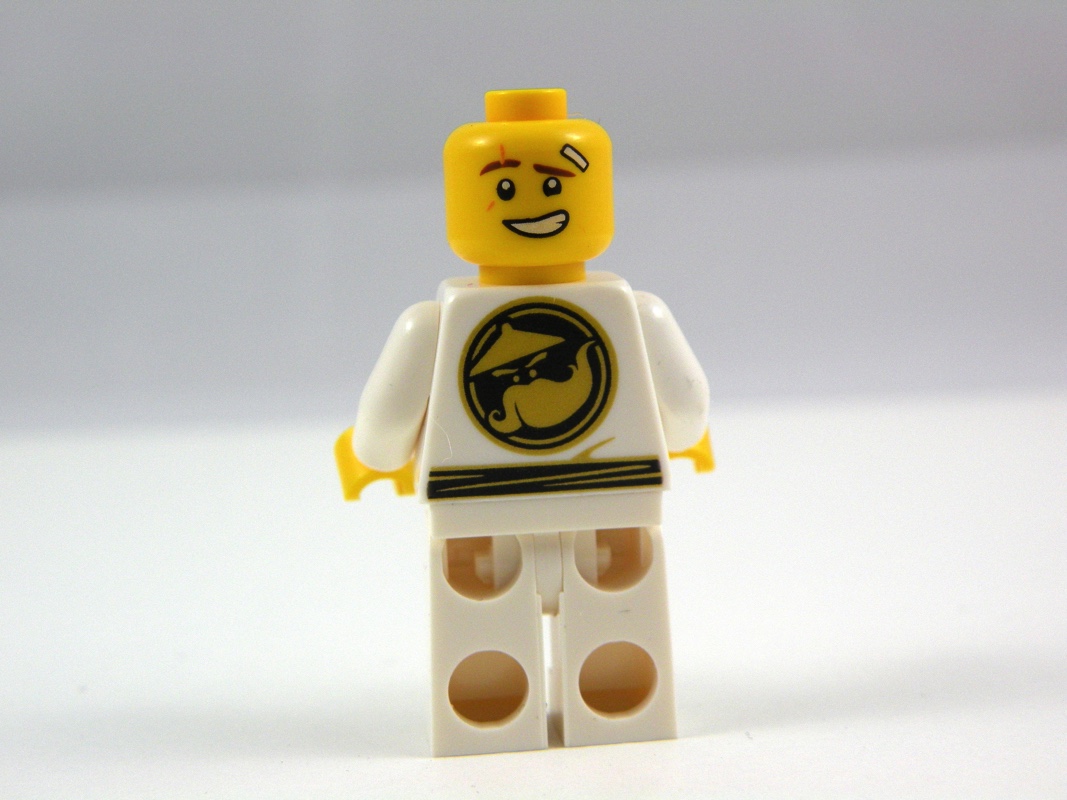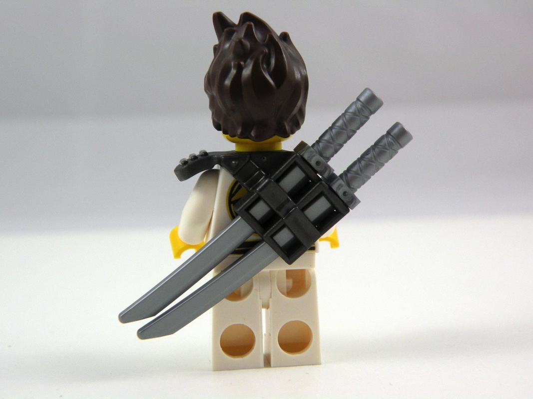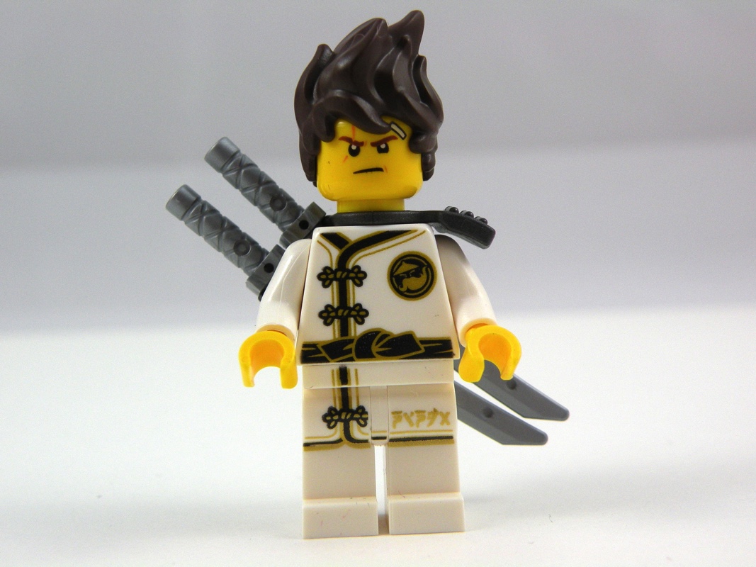 On y ajoute ensuite sur le côté droit la minifig de Kai. Cette minifig n’est pas exclusive (dommage), on peut en effet la retrouver dans le set 853702 – NINJAGO Movie Maker, mais elle est néanmoins très soignée. Il s’agit donc de Kai dans une tenue blanche, sans cagoule, joliment réalisée avec les boutons et la ceinture tampographiés sur le torse, ainsi qu’un emblème que les fans de Ninjago sauront mieux déchiffrer que moi. On retrouve également cet emblème sur le dos de la minifig. Une coiffure en pétard, et un fourreau permettant d’accueillir deux katanas viennent compléter l’ensemble. Nous avons également droit à un double visage, l’un souriant et l’autre plutôt menaçant.