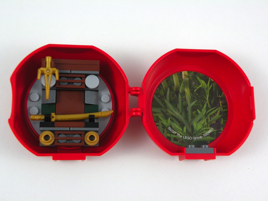 A l’ouverture de celui-ci, on retrouve la capsule en position fermée, contenant un sachet de pièces, et une notice d’instructions se résumant à une page format A4, recto-verso, pliée dans le polybag. 7 étapes suffisent à l’assemblage du Pod, contenant d’un côté un morceau de dojo et ses armes dorées, de l’autre la minifig de Kai avec ses katanas dans le dos.