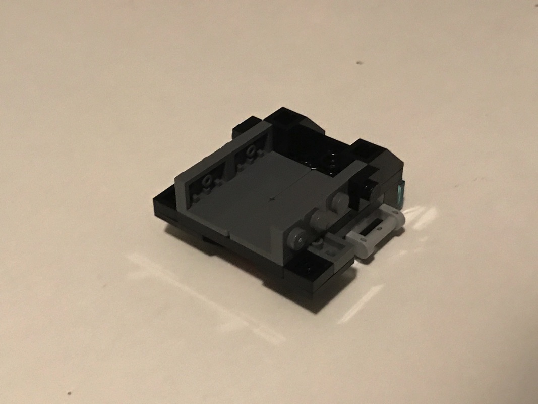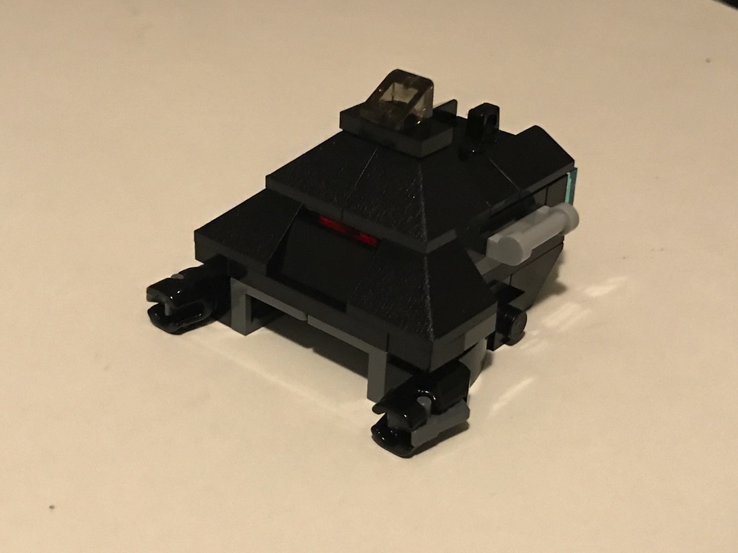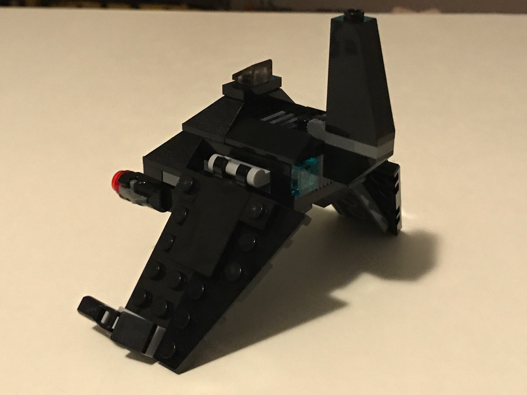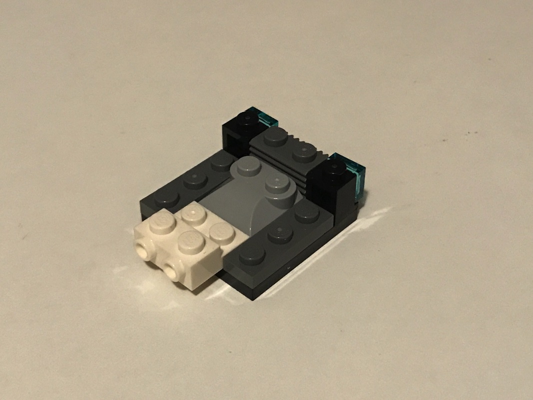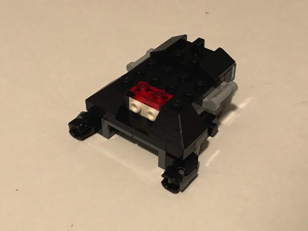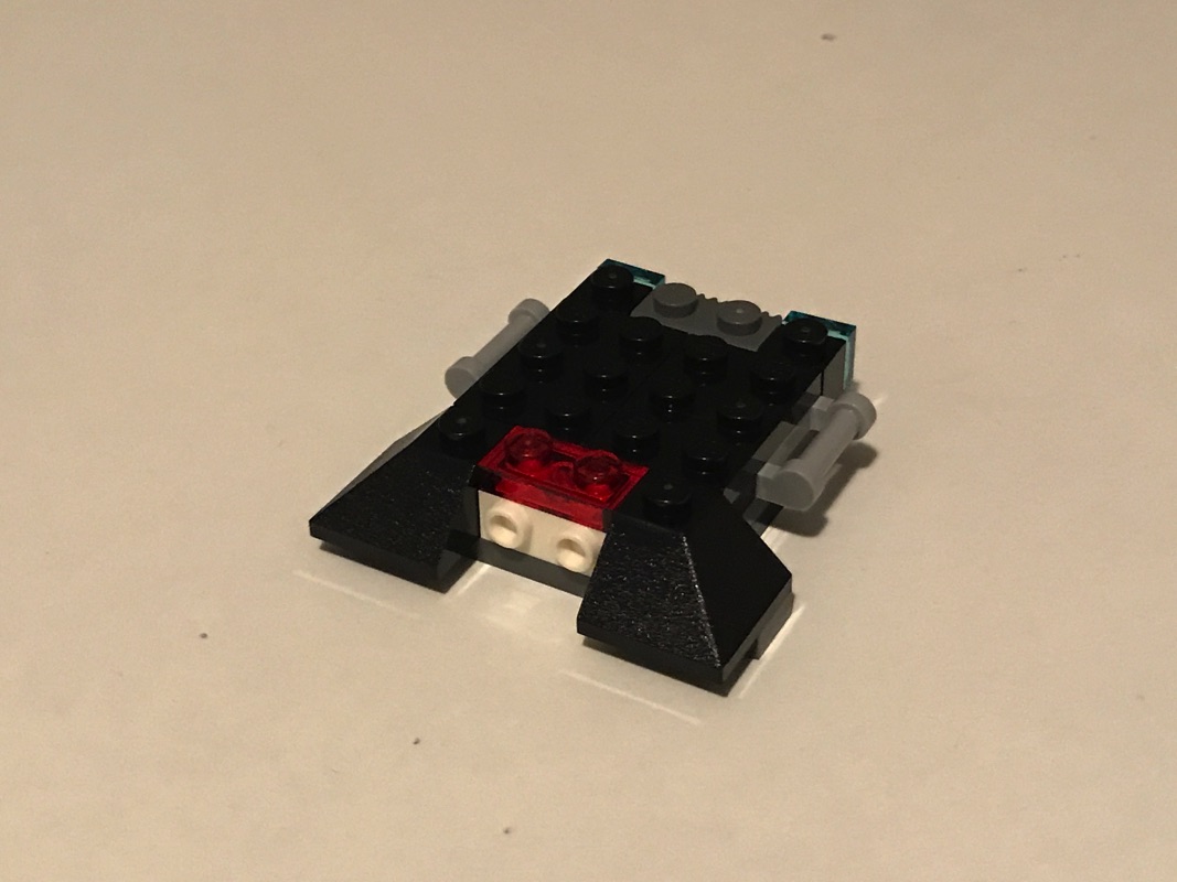 Le montage est assez simple. On commence par assembler le « coeur » du vaisseau, avec le poste de pilotage et sa petite slope en trans-black derrière laquelle vient prendre place notre pilote. On notera, juste en dessous de ce dernier, la présence d’une plate en trans-red, dont seule la tranche reste visible, qui apporte une note de couleur bien pensée sur l’ensemble noir du vaisseau. L’arrière du vaisseau n’est pas en reste, avec deux tiles 1×1 en trans-light blue pour modéliser les propulseurs. On vient également assembler 2 Light Bluish Gray Plate, Modified 1 x 2 with Handle on Side – Closed Ends, qui serviront de supports aux futures « ailes » du vaisseau, tout en assurant la possibilité de les replier.