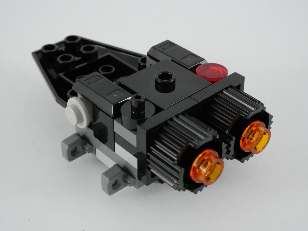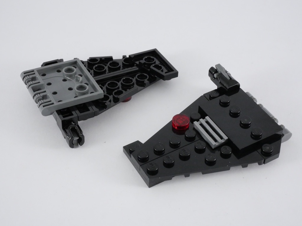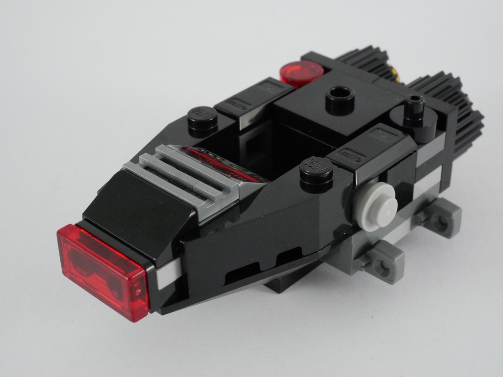 La construction de l’engin ne prend guère plus de 10 minutes. On commence par la partie centrale et son « cockpit » (comme d’habitude, un petit espace de 2×2 tenons permettant d’asseoir le pilote), avec quelques greebles sur la partie arrière et deux réacteurs réalisés avec des briques rondes texturées. A l’avant, une tile rouge translucide nous rappelle la couleur caractéristique de la verrière de l’engin, telle qu’on peut la voir dans le set 75256 Kylo Ren’s Shuttle (vous retrouverez d’ailleurs mon test de ce set à cette adresse).