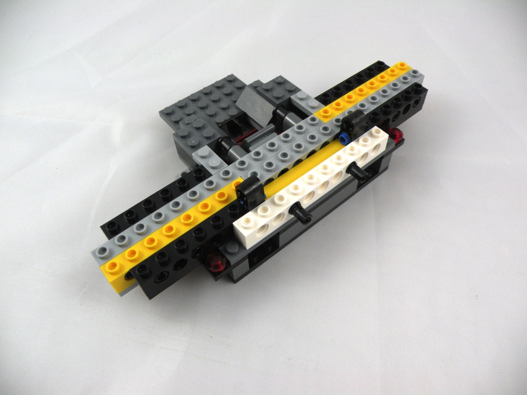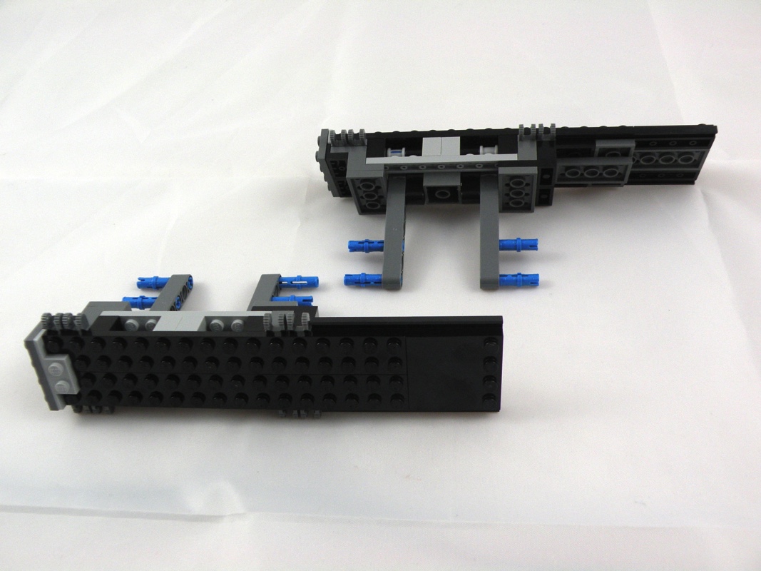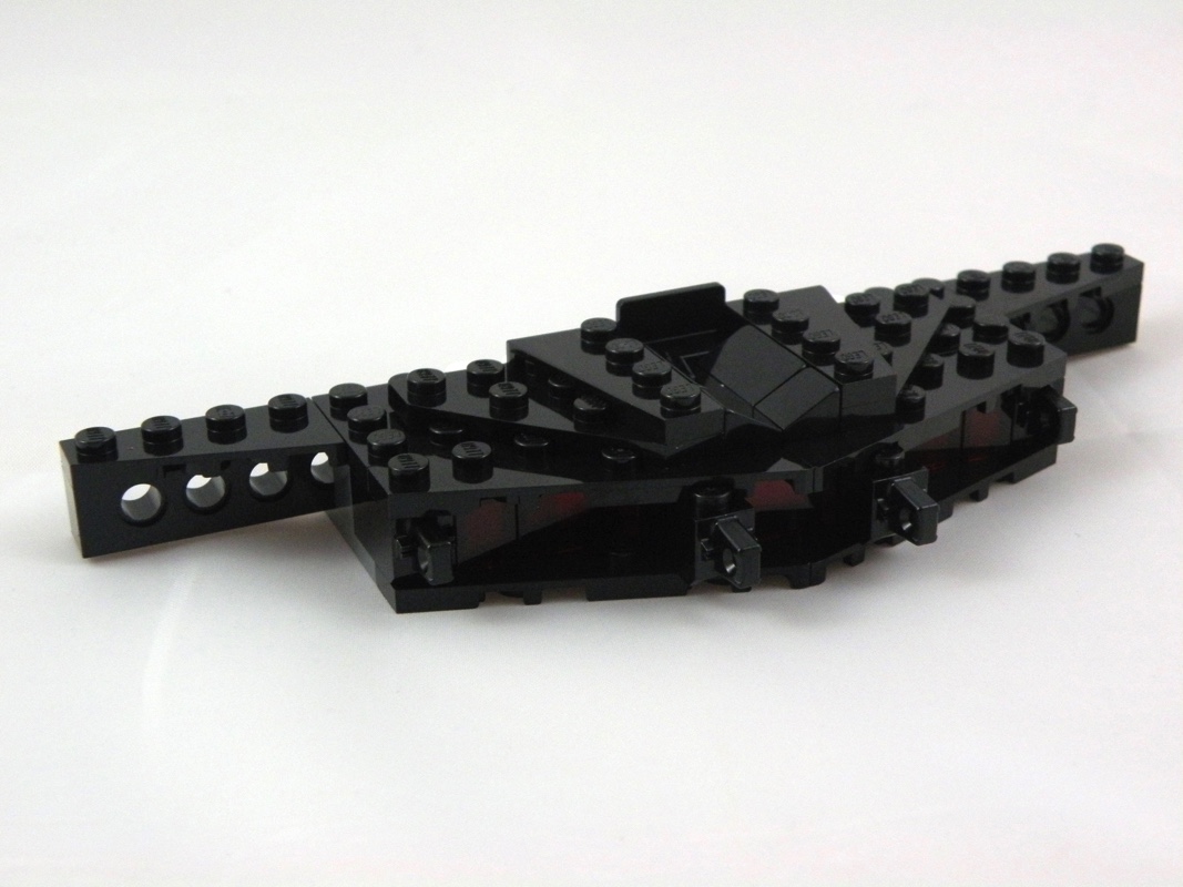 Un peu plus d’une heure est nécessaire à assembler le vaisseau. On réalise tout d’abord son « ossature », à l’aide de pièces Technic, c’est d’ailleurs dans cette étape qu’on retrouve une petite astuce sympa, toujours à base de pièces Technic, visant à déporter la commande des fusils à ressorts.