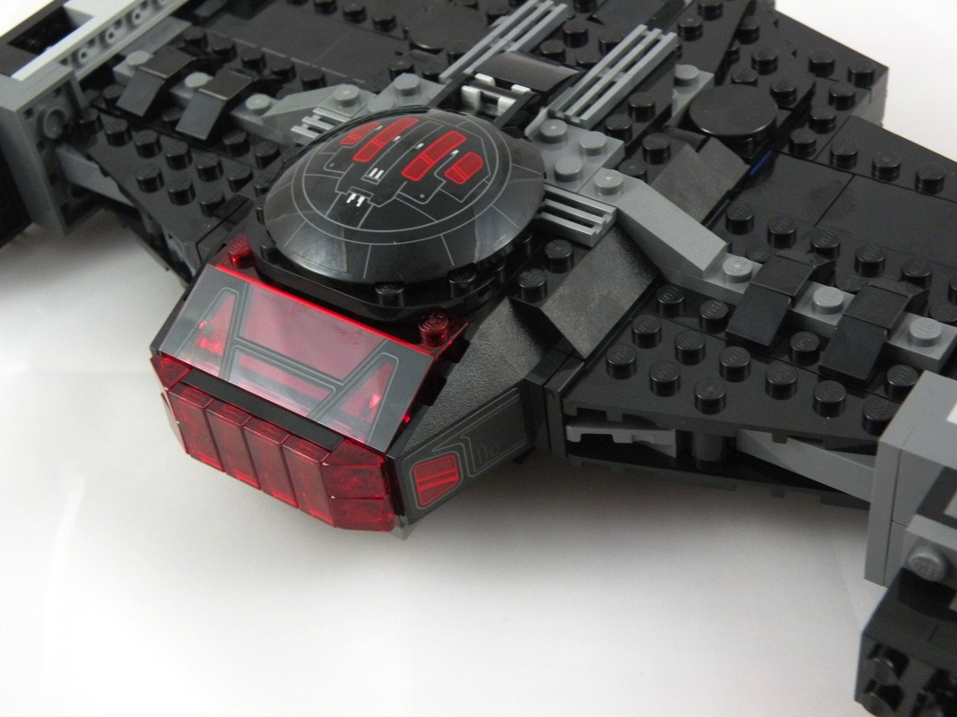 Vient ensuite l’assemblage du cockpit, tout en trans red, avec sa jolie verrière tampographiée, ses tiles et ses slopes qui viennent prendre place juste en dessous, avec les deux stickers flanqués de chaque côté. C’est joli, avec un look véritablement agressif qui se dégage. On ajoute également quelques éléments de décor sur les ailes, avec notamment deux canons factices.